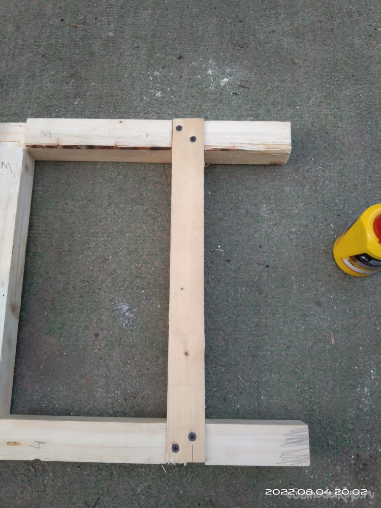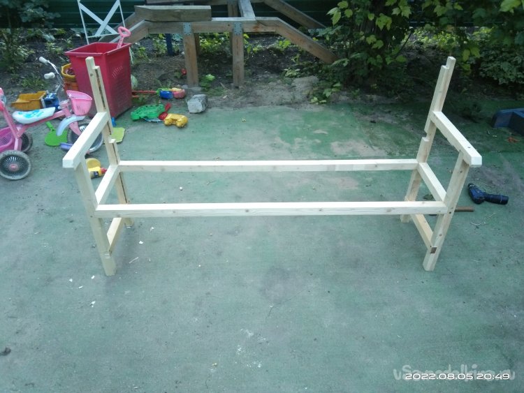 Закончив с самой муторной на мой взгляд работой по выборке пазов, приступаю к сборке боковых сторон скамьи. Отрезаю нужной длины заготовки из брусков и начинаю их устанавливать в пазы. Для соединения деталей я использовал столярный клей, а так же фиксацию деталей с помощью конфирматов, или как их чаще всего называют, на евровинты. Для них я заранее высверливал отверстие в скрепляемых частях лавки, затем тщательно промазывал места стыковки клеем. В отверстие так же заливал немного клея. Затем шестигранным ключов закручивал винты. Соединение достаточно жесткое, а после высыхания клея стало вообще монолитным. Если крепления производить только с помощью конфирмата, или другого какого-нибудь винта, самореза и т.д., то со временем под воздействием внешних факторов, нагрузки на скамью, все соединения будут не так хорошо держать между собой детали, скамья начнет расшатываться и в конечном итоге придет в негодность. Клей решает эту проблему. Но тут нужно оговориться, что для таких работ необходим клей которому не страшны ни влага, ни ультрафиолетовые лучи, т.к. изделие будет стоять на открытом воздухе практически постоянно. В некоторых местах, где было невозможно использовать евровинт я применил обычные саморезы с широким шагом.
