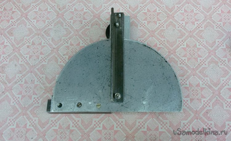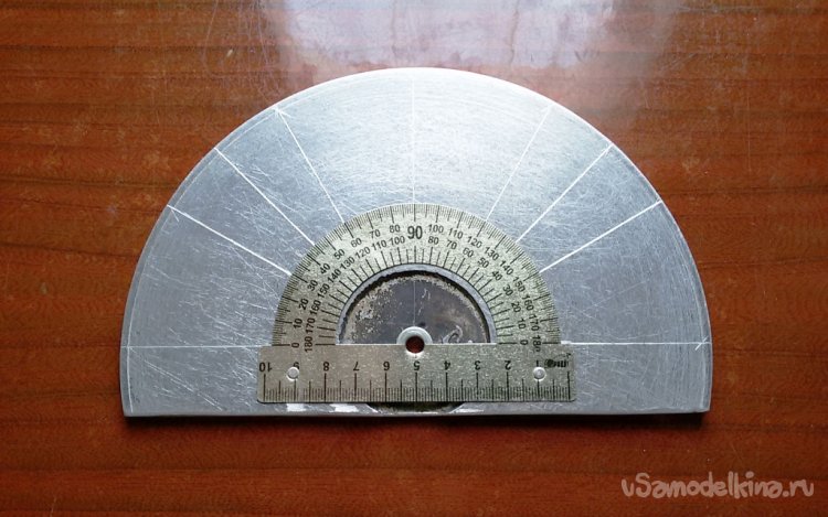 По линии координат установим транспортир, совместив центр его шкалы с центром основания. Закрепим транспортир на основании двумя заклепками диаметром 2 мм. В используемой заготовке основания под центром шкалы транспортира имеется понижение, заполним зазор шайбой нужной толщины.