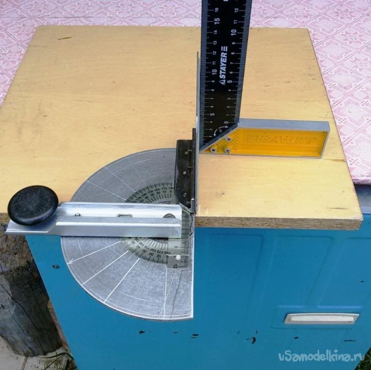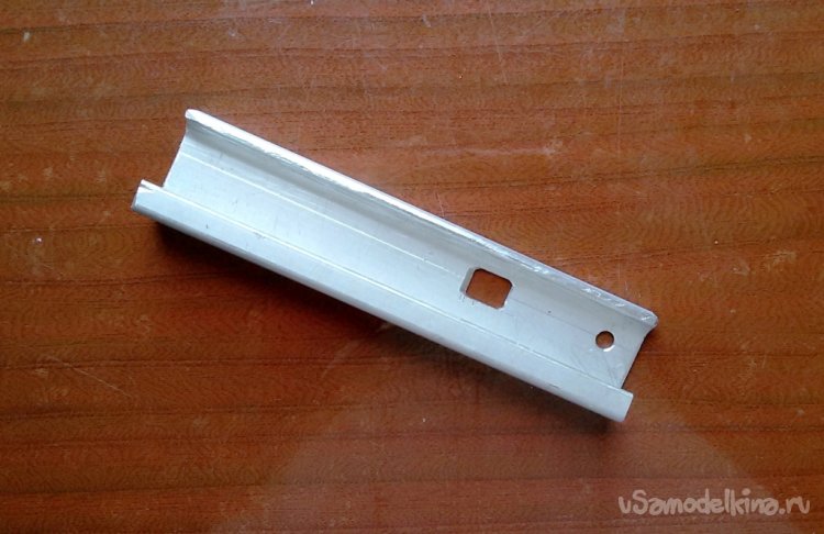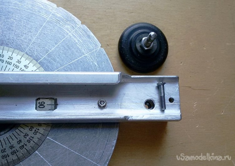 Верхний элемент подвижной части изготовлен из алюминиевого профиля шириной 35 мм, ранее используемый для изготовления ручек в мебельной промышленности. Длина этой заготовки также 160 мм. Эта деталь будет исполнять роль указателя угла наклона пилы. Отгиб в профиле служит для удержания прибора в работе.