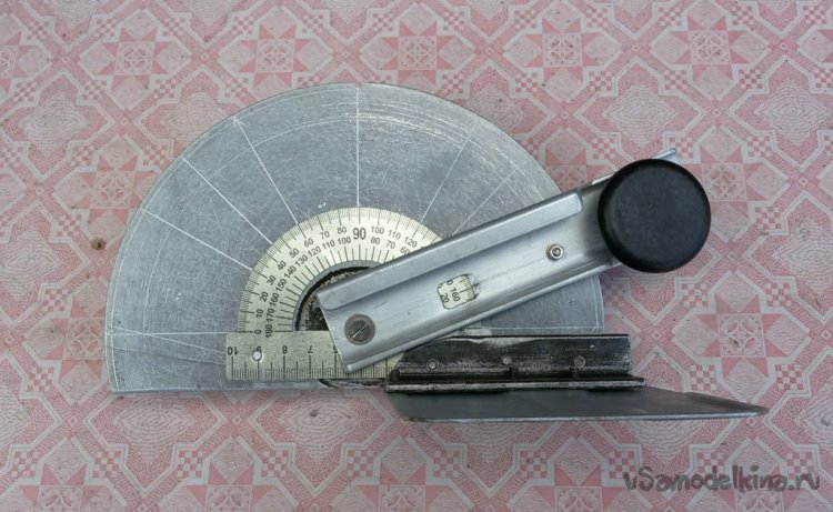 Углубленная разметочная линия, проходящая вдоль детали через центр оси вращения в верхнем элементе подвижной части (далее - указателе), будет служить центральной измерительной линией. Симметрично ее, на расстоянии радиуса шкалы транспортира от центра вращения, вырежем окно для контроля угла. На скошенной верхней части окна, соответственно центральной линии, наносится контрольная риска.