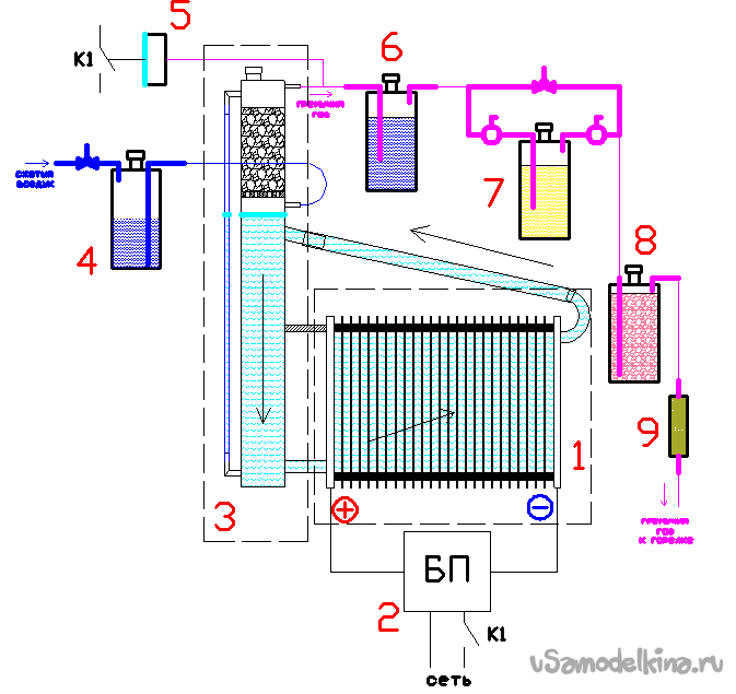 Рис. 2 Схема соединения аппаратов электролизера, где – 1 – реактор, 2 – блок питания реактора, 3 – бак-накопитель с фильтром отделителем пены, 4 – подпитыватель, 5 – реле давления, 6 – водяной затвор, 7 – бензиновый барботер-промывалка, 8 – осушитель, 9 – фильтр тонкой очистки.