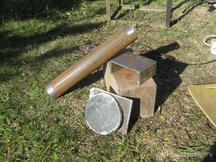 Фото 3. Основные заготовки аппарата. Обрезок швеллера назначен дном. Нашедшаяся пара нетонких стальных пластин автоматически решила задачу широкого герметичного загрузочного люка. Он будет фланцевого типа во весь зев трубы.