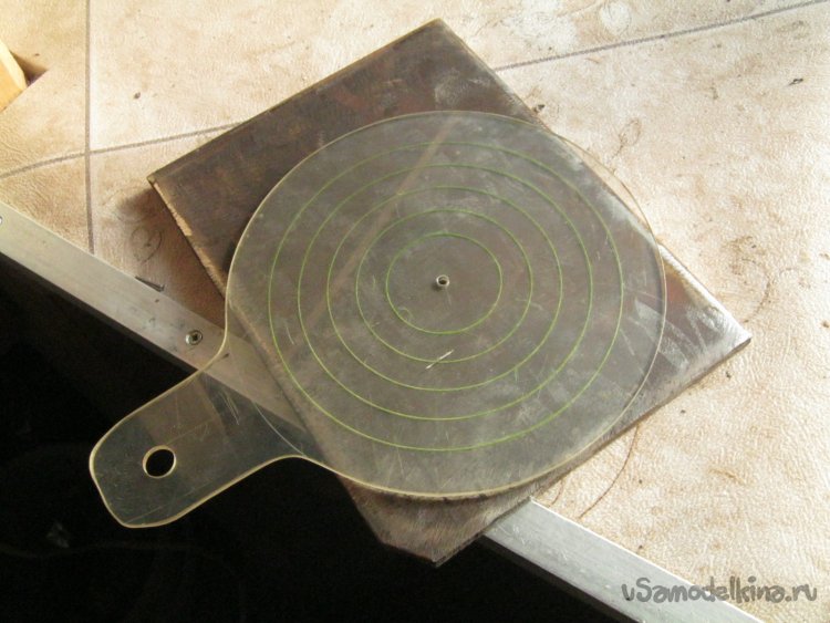 Фото 6. Центр заготовок нашел специальным самодельным инструментом-прицелом – центроискателем. Отметил спиртовым фломастером и тюкнул керном. Нарисовал на железке окружность чертежным циркулем.
