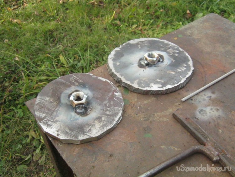 Фото 8. Некий аналог точения таки пришлось применить, но в самодельном станке по дереву. Для установки заготовки на шпиндель, приварил в центре каждой заготовки по соответствующей гайке.