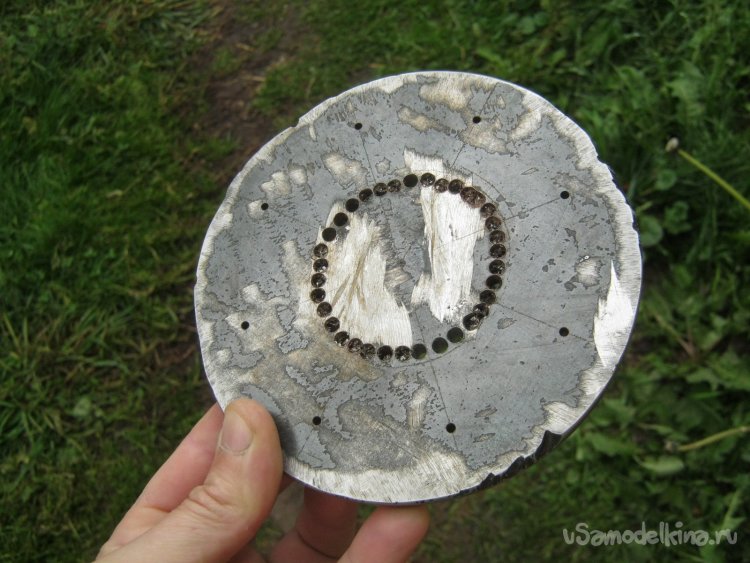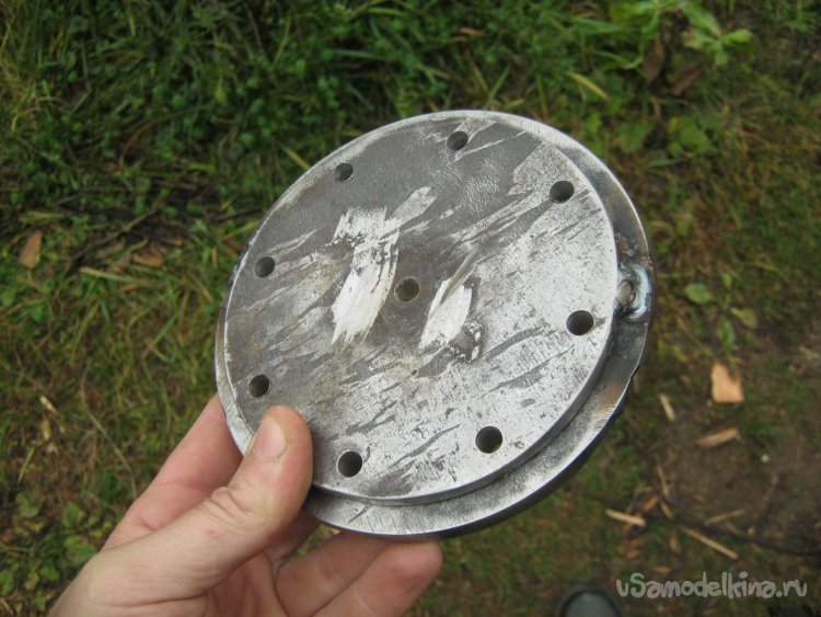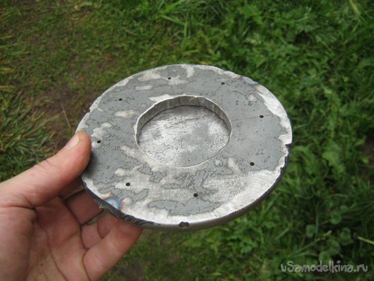 Фото 10. Обточенная заготовка фланца. Размечены и вчерне просверлены отверстия для ряда стяжных болтов, высверлена середина для доступа внутрь емкости. Сверлил на станке.