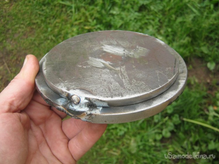 Фото 11. Отверстия для болтов должны точно совпадать у обеих деталей. Для этого сверлил их вместе, скрепив в двух местах сваркой в тисках. Вид со стороны будущего люка. Разный диаметр деталей вынужденно – стачивать бОльшую пришлось бы слишком долго, а пускать искры в деревянной мастерской, более минимально необходимого – испытывать судьбу. Для однозначного положения деталей в работе, сделал на обоих метку – неглубокий надрез на краях.