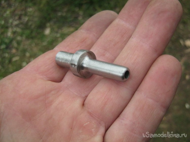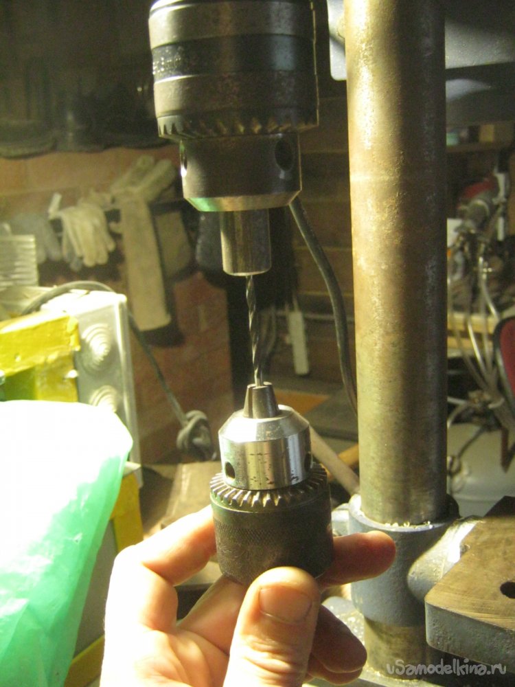 Фото 17. Недлинный отрезок прута накернил с обеих сторон по центру и более-менее точно просверлил по оси. Очень помогает сверление наоборот – деталь вращается, сверло неподвижно.