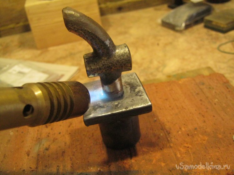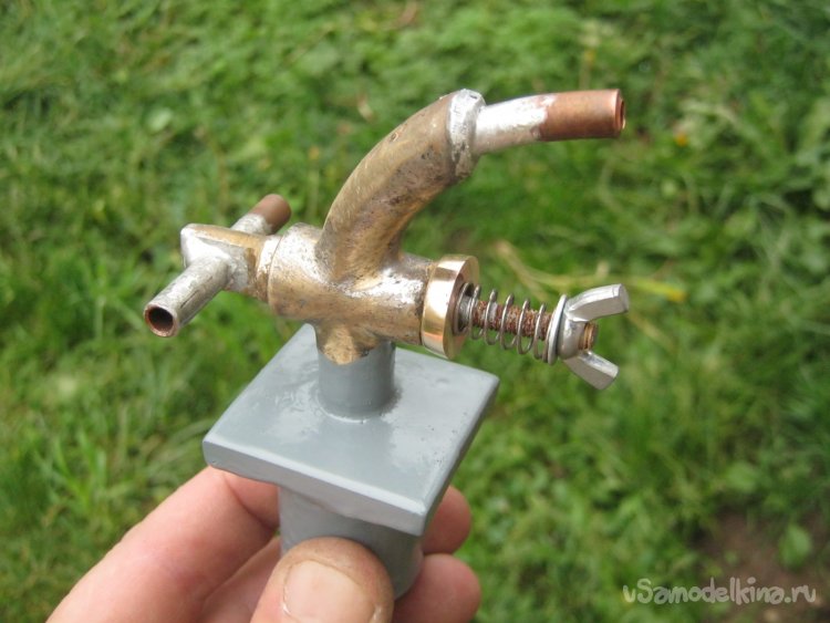 Фото 20. В массивную железку из черной стали бронзовый краник впаял горелкой со специальным кислым флюсом для огневой пайки и припоем олово-медь. Отмыл остатки флюса в УЗ мойке. Аналогично впаял в носик краника кусочек медной трубки для отводящего шланга.
