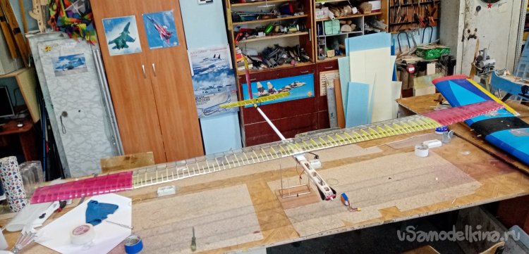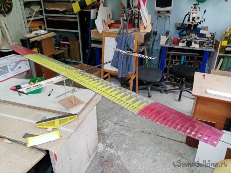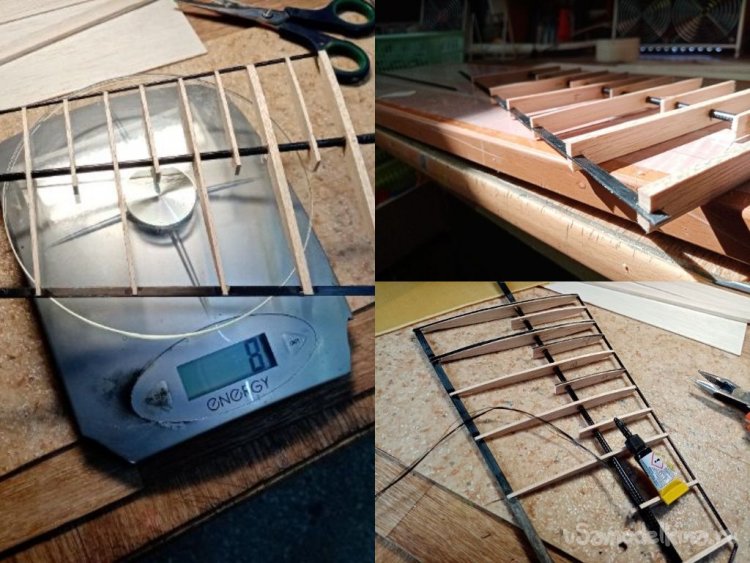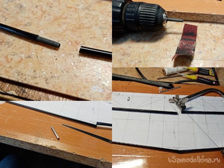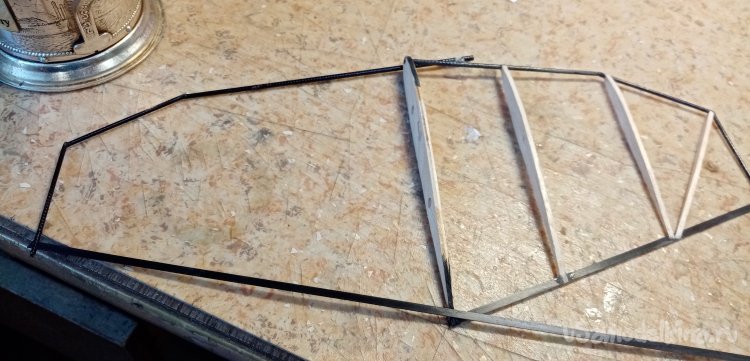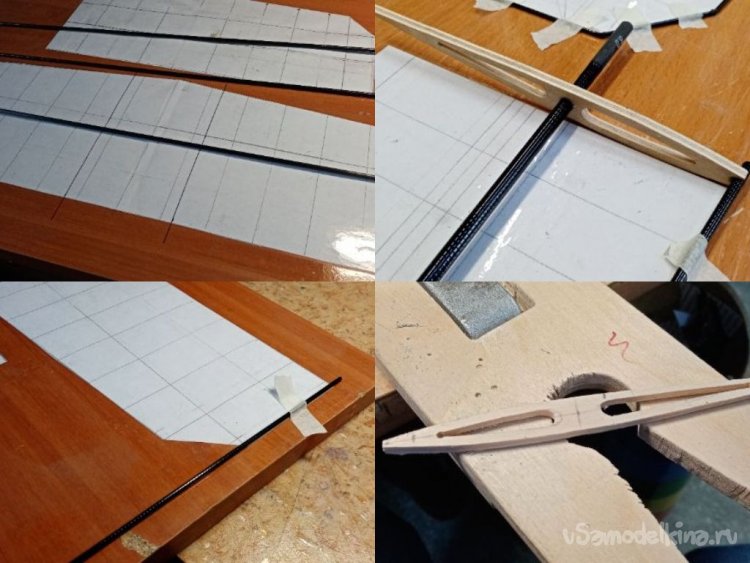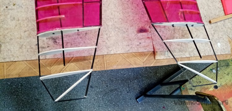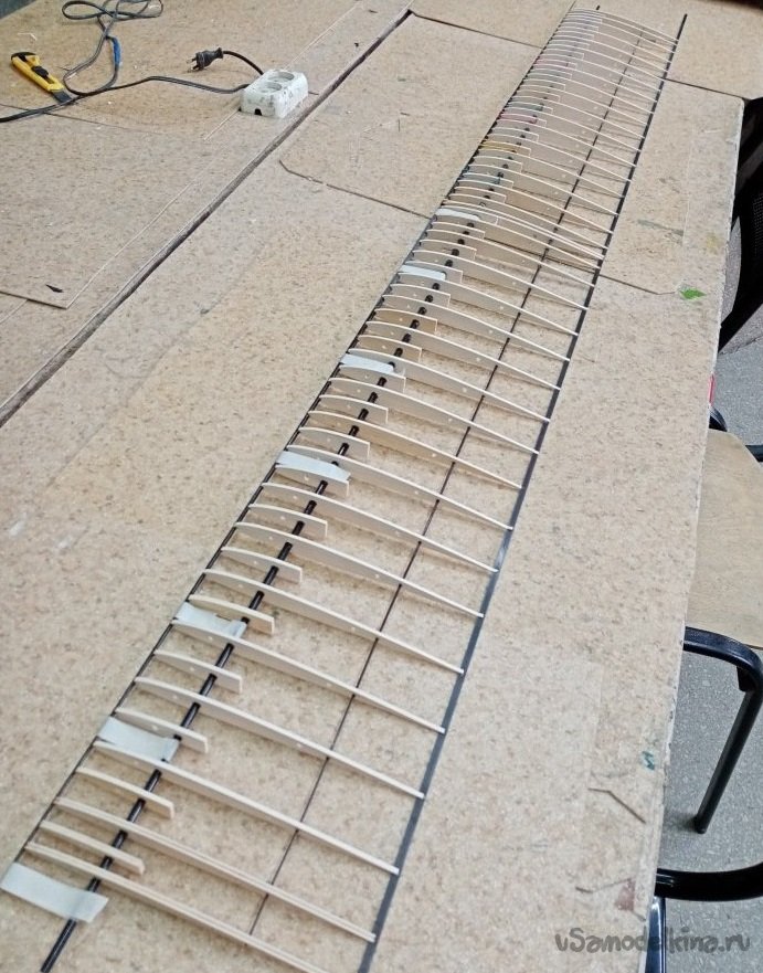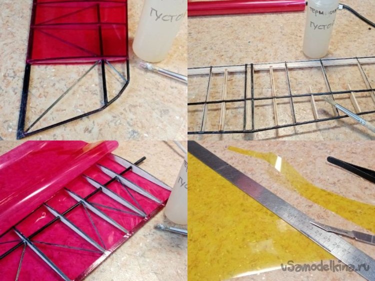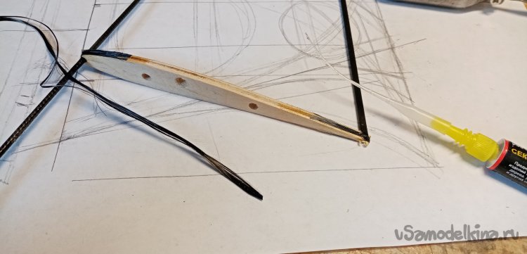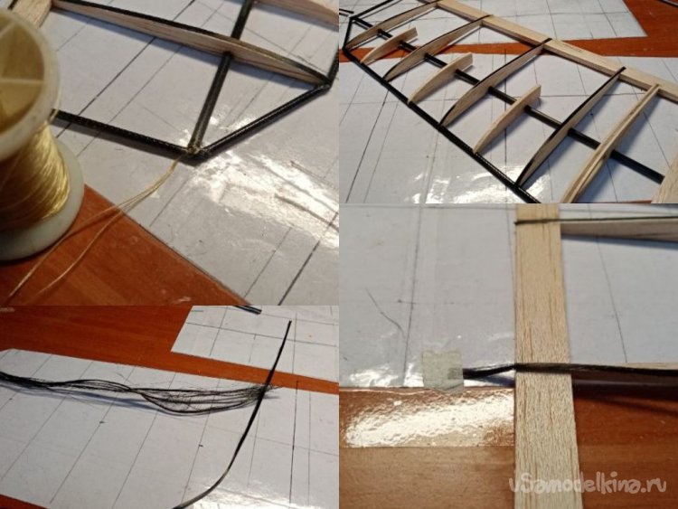 Дополнительно углы соединения трубочек проклеиваю циакрином и проматываю капроновой никой. После окончательной отделки всех элементов монтирую усиление и углеровинга по всем нервюрам.