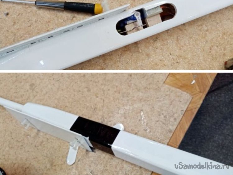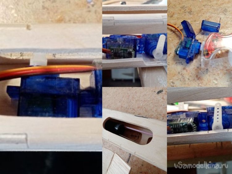 Для управления рулем высоты и рулем направления, нужно установить сервоприводы. Использовал простые, девяти граммовые, с усилием в полтора килограмма. Но возникла проблема. Во время борьбы с минимальным миделем фюзеляжа ошибся на пару миллиметров с внутренним объемом. Поэтому снял с сервоприводов нижние крышки. Открывшуюся электронику защитил простым прозрачным скотчем. В борту фюзеляжа прорезал небольшие выемки для нормального вращения качалок. Установил сервоприводы при помощи распорок из бальзы. Все заклеил на титан.