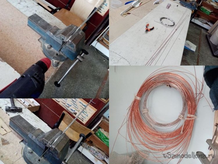 Зажимаю изогнутую трубку в тиски. Протягиваю проволоку через нее, на свободный длинный конец надеваю длинную алюминиевую трубку, которая упирается в стену. Начинаю процесс предварительно одев на правую руку перчатку. В левой дрель на максимальных оборотах. Тяну медленно проволоку, рукой в перчатке придерживаю выходящий конец, не даю ему сильно вибрировать.