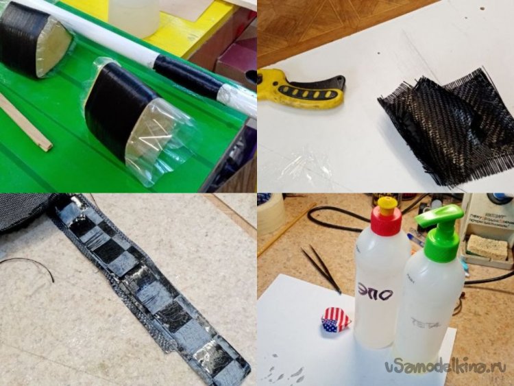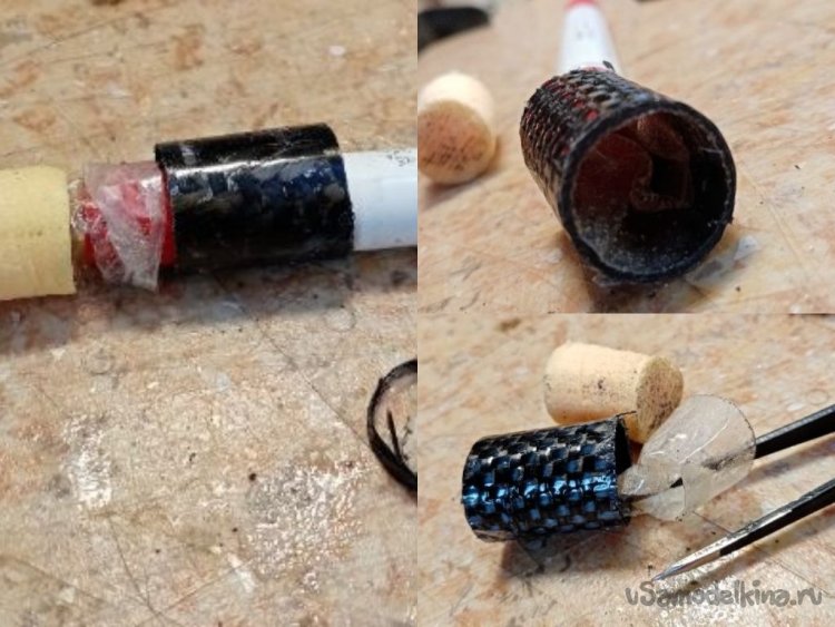 Вырезаю заготовки из угольной ткани с легким припуском по размерам. Режу ткань роликовым ножом. Для удобства работы немного наношу клей спрей «3М 77», подсушиваю, чтобы не сильно лип. Такой прием позволяет нормально работать с углетканью, края не лохматятся и не осыпаются. После легкой пропитки её можно без проблем резать и обычными ножницами. Установочную трубочку решил намотать прямо на фюзеляже. Предварительно защищаю его пленкой. Деталь склеена из нескольких слоев углеткани на эпоксидной смоле. После наложения углеткани со смолой на шаблон, сверху весь «бутерброд» закрываю пленкой и прижимаю при помощи изоленты, не сильно натягивая.