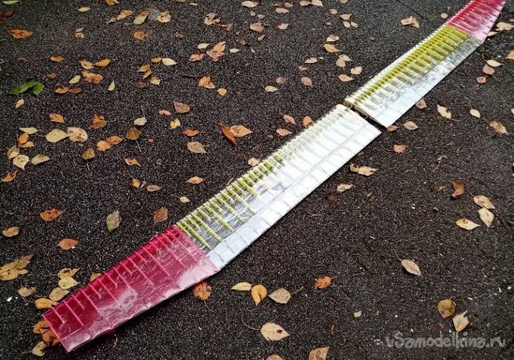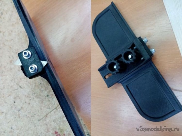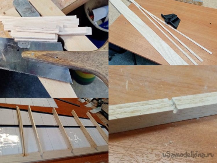 Прорезаю по разметке пазы в задней кромке. По разметке нарезаю из двух миллиметровой бальзы реек нужной ширины. В этой процедуре использую специальный резак. Напечатанный на принтере товарищем по борьбе Виктором.