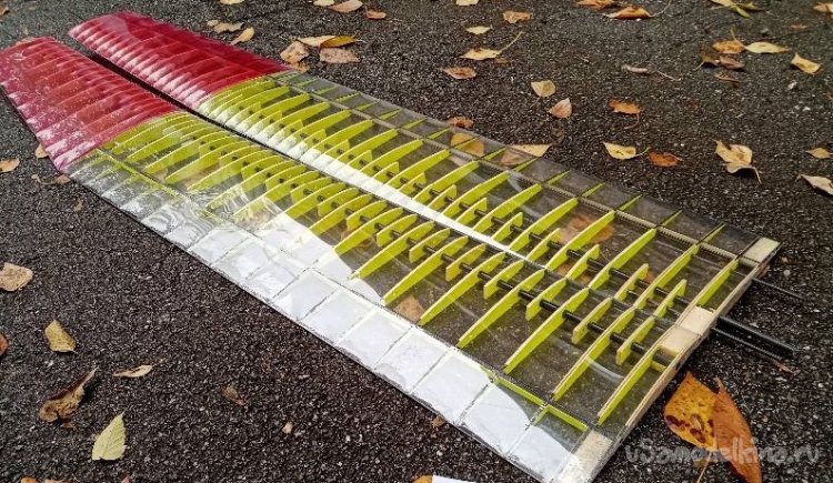 Затем самодельной пилкой резу на заготовки нужной длинны. В заготовках вырезаю пазы под трубки передней кромкам и центрального лонжерона.