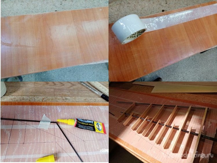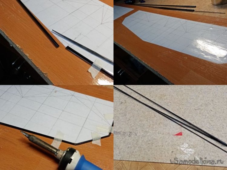 Начинаю с руля направления. Из кусочка мебельного щита толщиной в шестнадцать миллиметров изготовлен стапель. Для защиты от циакрина он оклеен белым цветным скотчем, на котором вычерчены размеры детали. Линии проведены простой ручкой. Хорошо видно, неточности можно спокойно смыть спиртом и прочертить новые. Передняя кромка выполнена из трубчатого хлыстика удочки, сечением в корне в 3 миллиметра, согнутого в нужных местах при помощи жала паяльника. Регулируемая температура установлена в 170 градусов. После сгибания деталь зафиксирована на стапеле при помощи малярного скотча и места сгиба проклеены циакрином. Центральный лонжерон изготовлен из такого же хлыстика улочки, сечением в корне в шесть миллиметров.