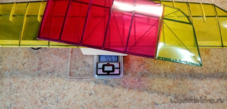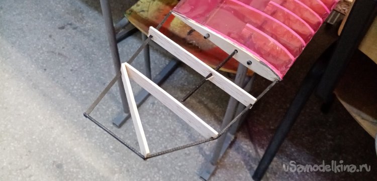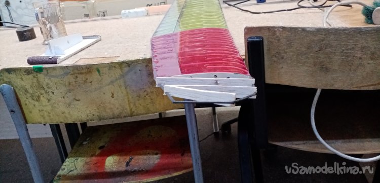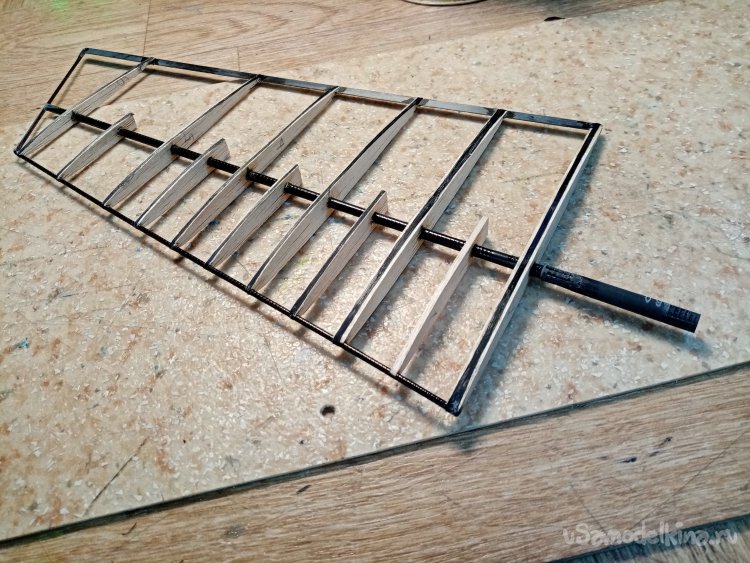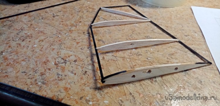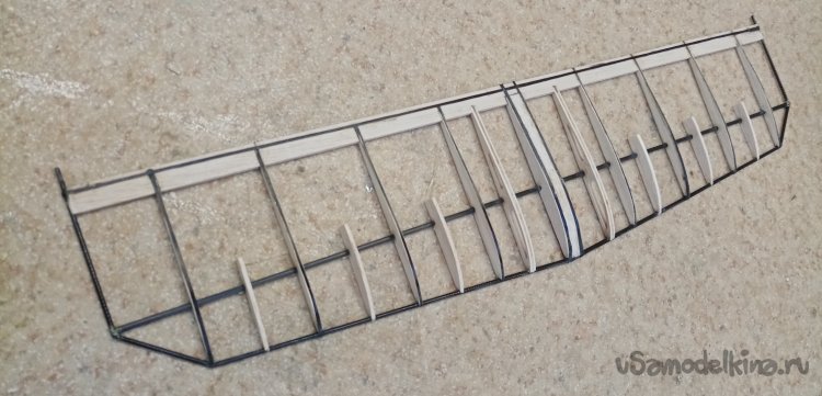 Первые две нервюры изготовлены из «тяжелой» бальзы, толщиной в три миллиметра, остальные из двухмиллиметровой. Задняя кромка врезана из угольного прутка размером 1х3 миллиметра. Вся конструкция склеена циакрином.