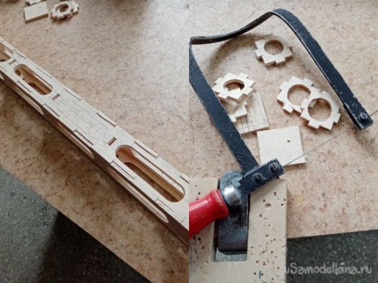 Перехожу к изготовлению фюзеляжа. Стенки выпиливаю лобзиком из 4 миллиметровой шлифованной фанеры с большими окнами облегчения. Все четыре стенки вычерчиваю сразу на одном листе, так достигается необходимая точность сопряжения вырезов стыковки на боковых гранях. Сразу, вычерчиваю и внутренние перегородки усиления с отверстиями для прохождения внутреннего оборудования. Заготовки пилю модернизированным лобзиком с пилками номер три.