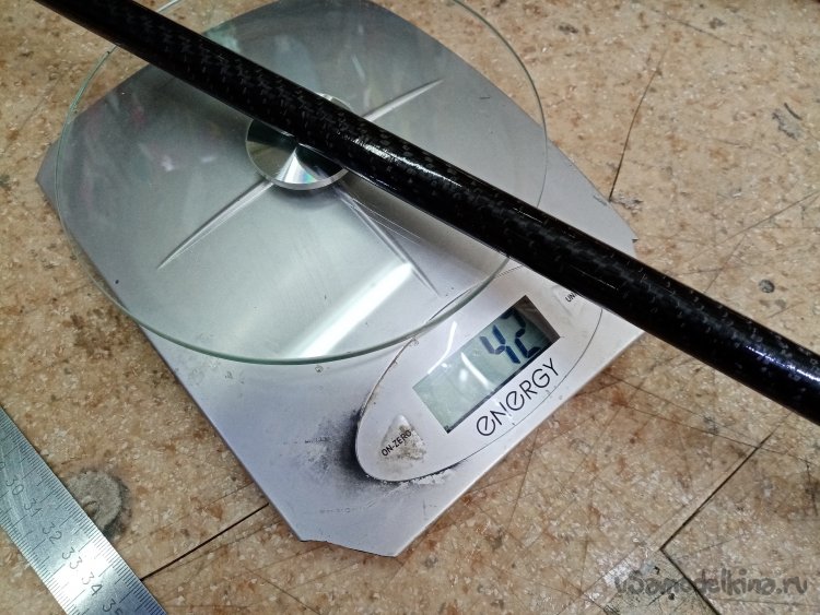 Возникла проблема соединения трубочек в центральной части стабилизатора. Изначально планировал вставить внутрь отрезок алюминиевой жесткой проволоки Д16т. Но весы показали, что нужно заменить, тяжело получается. При работе постоянно слежу за весом отдельных частей. Упустишь там грамм, тут грамм, набежал лишний килограмм. Подобрал отрезок такой же угольной трубочки, немного обточил, зажав заготовку в шуруповерте при помощи шкурки под внутренний диаметр лонжерона. Вклеил на циакрине.