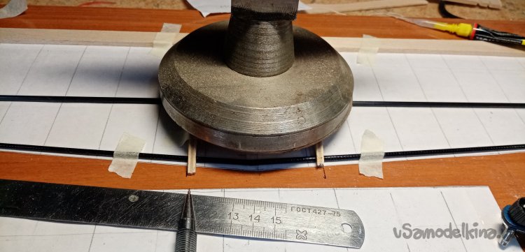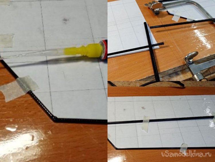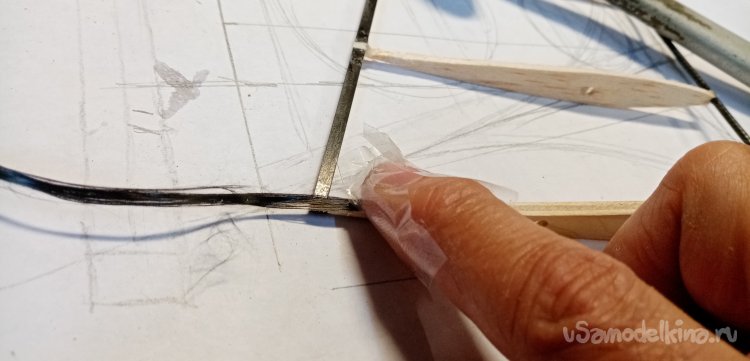 Все на той-же доске, расчерчиваю размеры шариковой ручкой. Передняя кромка из хлыстиков рыболовных диаметром в корне в 2 миллиметра. Закрепляю кончик на чертеже при помощи малярного скотча, по месту сгибаю пальником, закрепляю скотчем и проливаю изгиб циакрином.