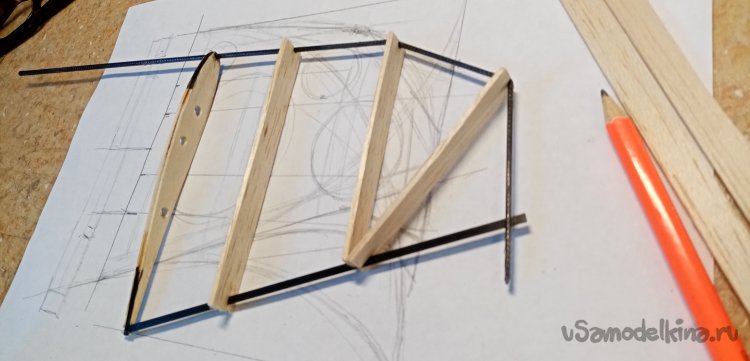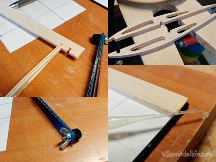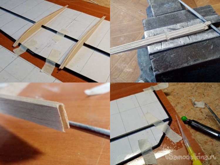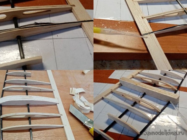 По чертежу врезаю в контур ушка заготовки нервюр из бальзы толщиной в 1.5 миллиметра. Все детали приклеиваю на циакрин.