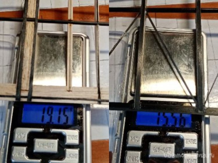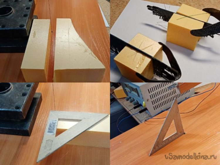 Начинаю изготовление петли крепления площадки к «рожкам». Основная задача, изготовит эту деталь цельной. Конструкцион напоминает букву «Ш» с длинной центральной палочкой и короткими боковыми. Предварительно уже обрезал и подогнал рожки крепления конструкции к хвостовой балке. Снимаю размеры, по ним нужно изготовить шаблон. Он состоит из двух кубиков утеплителя. Подбираю подходящую заготовку. Перед работой проверяю перпендикулярность установки струны на терморезаке. В качестве ограничителя устанавливаю массивную железяку. Процесс пошел. Нарезал нужных заготовок.