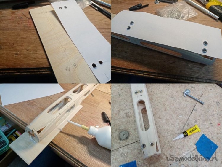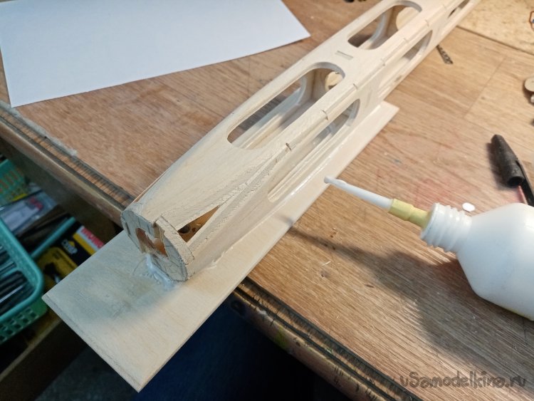 Выпилив все детали фюзеляжа, начинаю его сборку при помощи клея ПВА 3D super. Клей такого типа имеет повышенную влагостойкость. После высыхания основного каркаса, еще раз проливаю все стыки клеем. На этом этапе не устанавливаю пока мотораму, нужно еще закрепить хвостовую балку. Хвостовая балки изготовлена из колена удочки подходящего диаметра и длинны.