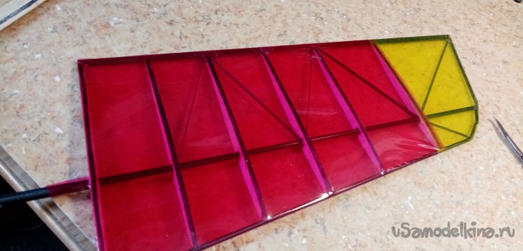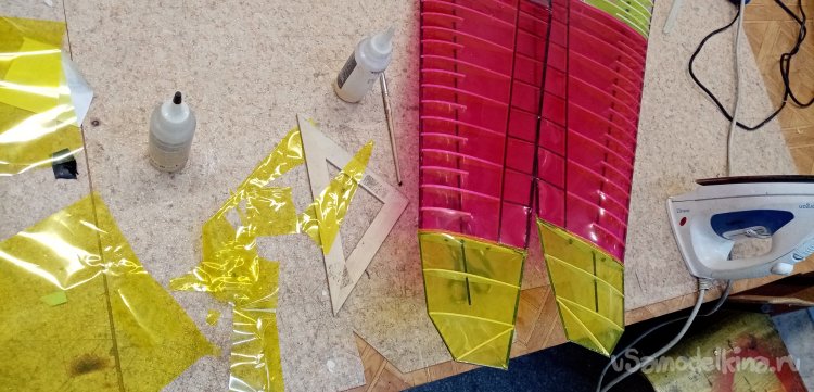 Обтягиваю ушки прозрачной крашенной лавсановой пленкой по стандартной технологии. Сначала промазываю каркас ушка разведенным термореактивным клеем. Затем второй слой более густым. Раскраиваю пленку с некоторым припуском примерно по пять сантиметров с каждой стороны и обтягиваю каркас ушка по контуру. Особенно тщательно место соединения с крылом. Поскольку место склейки небольшой площади, при нагреве обшивки на завершающем этапе она может поползти. Отрезаю излишки пленки. Промазываю торцы клеем и обтягиваю вторую сторону каркаса. Нужно стараться укладывать пленку ровнее, без складок и волнушек. Натягивать можно при помощи утюга или строительным феном с регулировкой температуры.