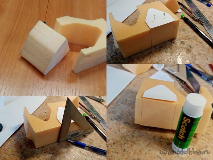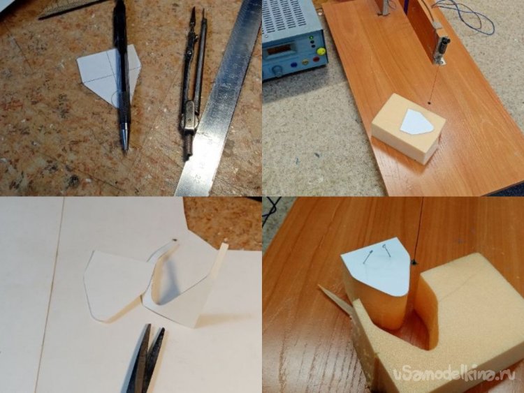 По размерам вычерчиваю на полукартоне шаблоны на рога крепления руля. Вырезаю обыкновенными ножницами стараясь резать ровно без задиров. По граням бумаги будет скользить струна терморезака. На подходящем кусочке пеноплекса закрепляю шаблон при помощи иголок с одной стороны. Нужно расположить второй шаблон симметрично с противоположной стороны, чтобы обеспечить перпендикулярность реза. Использую угольник, размечаю положение, закреплю второй шаблон клеем.