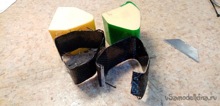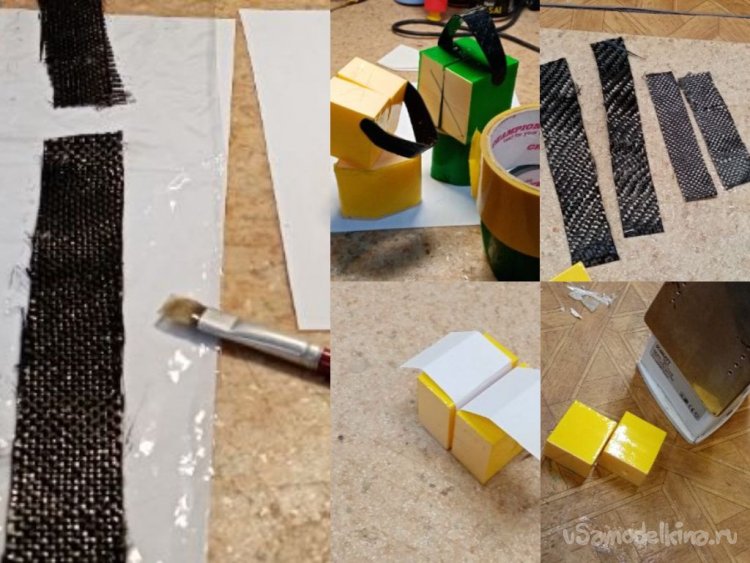При помощи бумажных полосок определяю габариты угольных ленточек. Оклеиваю шаблоны скотчем. Для гарантии привариваю его утюгом к пенопласту. Нарезаю заготовок предварительно вспрыснув уголь клеем. Пропитываю эпоксидной смолой, которую развожу в количестве равному весу карбона.
