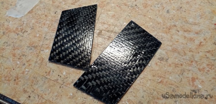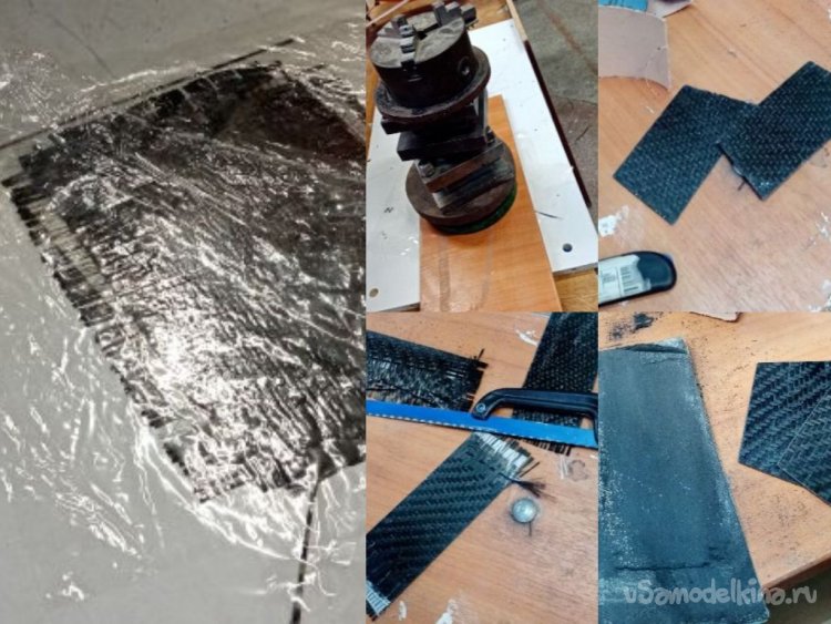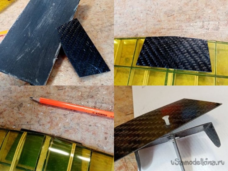 Параллельно с «рожками» заложил кароновую площадку для установки руля высоты. Процедура примерно такая-же. Углеткань слегка взбрызгиваю клеем. Дожидаюсь пока подсохнет, затем разрезаю на заготовки. Но пропитка смолой отличается. Укладываю на мебельную плиту несколько слоев пленки для защиты. Затем стопку нарезанных угольных заготовок. Отвешиваю и развожу по весу смолу. Равную весу углеткани. Поливаю заготовку, затем сверху еще один слой пленки. Все прокатываю жестким резиновым валиком разгоняя смолу. Заготовку накрываю вторым куском мебельного щита и под груз. После отвержения смолы разбираю конструкцию. Разрезаю готовую пластинку по размеру, поправляю шкуркой.