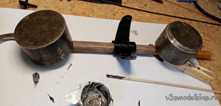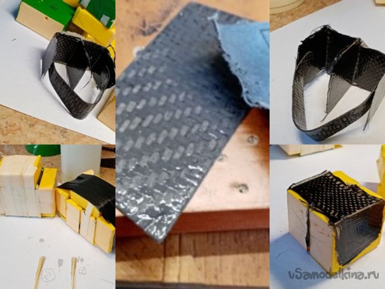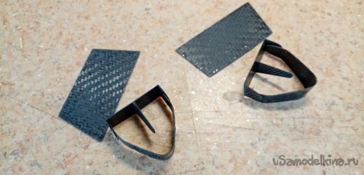 Зажимаю полоски карбона, пропитанные эпоксидной смолой в шаблоны, сверху укладываю пленку для защиты, обматываю все изолентой. После отвержения смолы извлекаю черновые заготовки. Проверяю, размер точно подходит под «рожки».