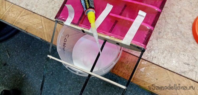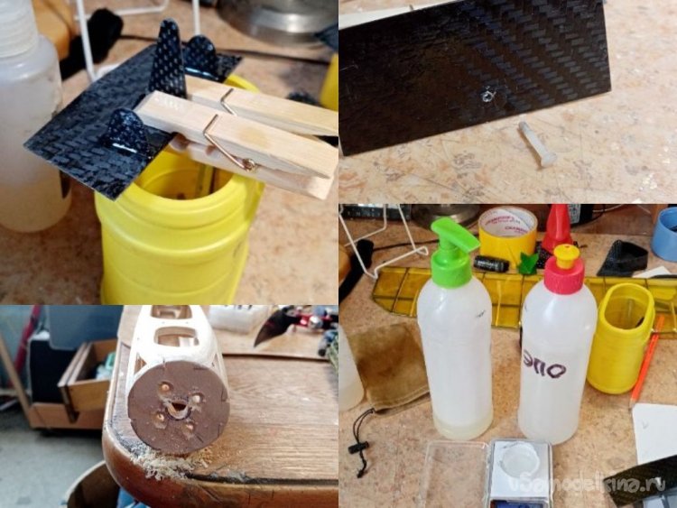После этой процедуры приклеиваю площадку крепления крыльев с заранее просверленными отверстиями. Закрепляю при помощи клея ПВА 3D super. Он имеет хорошую влагостойкость. Его разлил в маленькую бутылочку с тонким носиком, для удобства пользования.