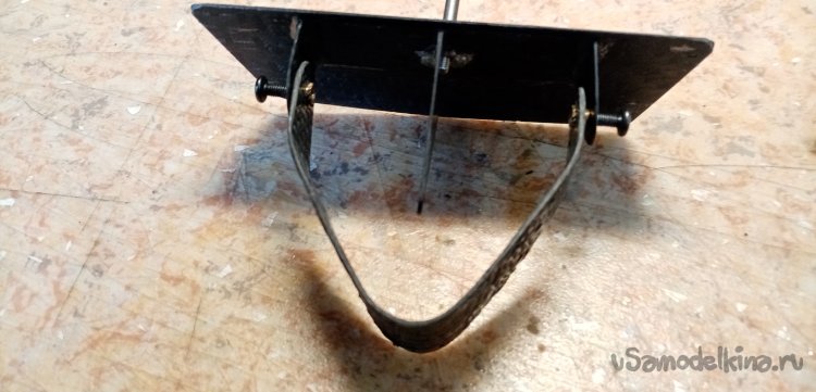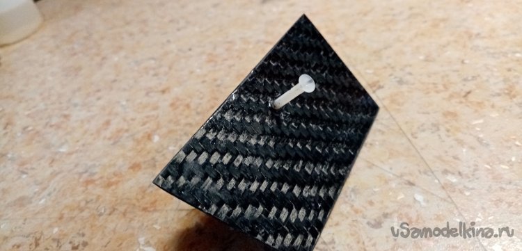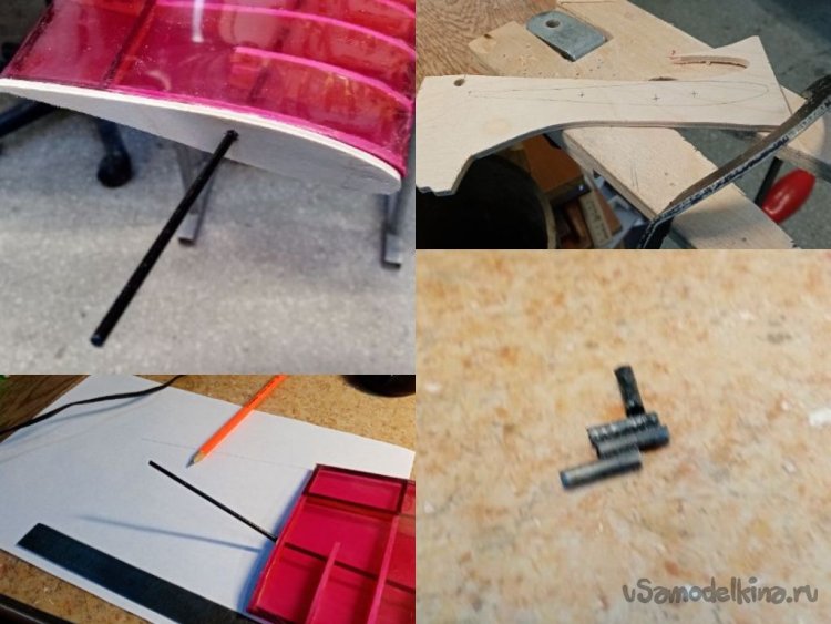 Еще раз подгоняю площадку по размеру крылышка. В букву «Ш» вклеиваю гайку на 3 миллиметра. В площадке сверлю отверстие под капроновый болтик крепления.