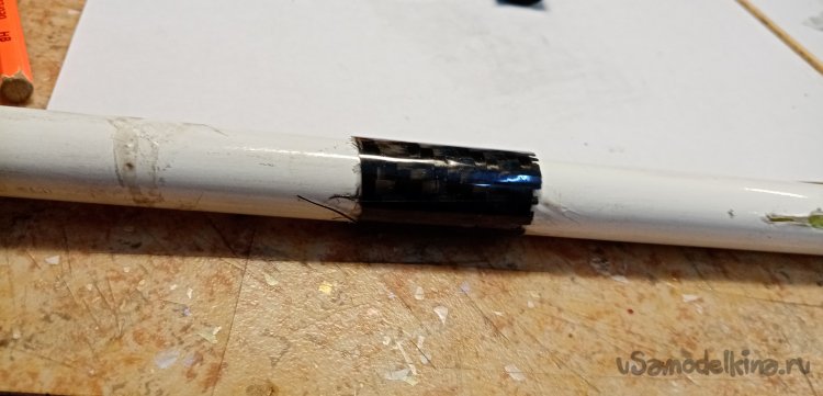 С трубочкой на хвостовой балке получилось гораздо хуже. Не смог снять углеткань. Пришлось осторожно разрезать. Балку зачистить в этом месте, по новой покрасить белой, двухкомпонентной, автомобильной эмалью. Придется, что то придумывать с этой трубочкой.