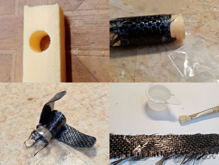 Промеряю диаметр балки в месте крепления держателя элеватора. Подбираю из своего арсенала трубочку, прорезаю в утеплителе отверстие. Вырезанный цилиндрик из пенопласта будет шаблоном. Оклеиваю полученный шаблон скотчем. Несколько слоев углеткани, готова фиксирующая трубочка. Отрезаю по размеру и приклеиваю эпоксидной смолой к «рожкам». Вклеиваю в рожки бронзовые гайки от крепления крышек ноутбуков. Подбираю подходящие болтики и шарниры готовы.