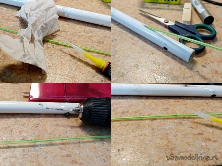 В трубочки вставляю проволочные тяги и закрепляю их в хвостовой балки при помощи пыжей из поролона. Заталкиваю из внутрь палочкой. Тяги установлены.