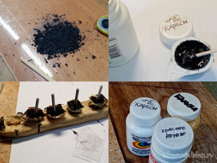 Пришла идея заменить пластиковый болтик фиксации руля высоты на самодельный. Дело в том, что для установки требуется шлицевая отвертка. Хочется минимизировать применение инструмента. Будет некоторое увеличение веса в хвостике. Возьму болтик по меньше на 2 миллиметра диаметром. Пришлось демонтировать с площадки гайку на 3 миллиметра и вклеить на два. Головку болтика буду делать самодельную. В качестве формы использую скульптурный пластилин. Оттискиваю в нем несколько форм под барашек. Но из одной смолы получатся непрочные головки. Поэтому применяю наполнитель из карбоновой нарезки. Ненужные кусочки ткани режу при помощи роликового ножа в труху. Развожу смолу и замешиваю некоторое количество наполнителя. Заливаю состав в формочки. Кончики шпилек на 2 миллиметра немного расплющиваю молотком и устанавливаю в смолу. Остатки карбонового наполнителя ссыпаю в баночку. У меня еже есть опилки бальзы, красного дерева, мраморной пудры и алюминиевой.