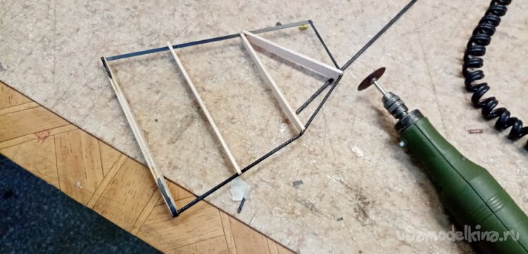 После сборки и склейки всей конструкции придаю нужный обтекаемый профиль при помощи утюжков со шкуркой различной зернистости. Конструкция руля направления, на данном этапе, получилась в восемь грамм. Стоит задача изготовить все хвостовое оперение легче 50 грамм, чтобы центровка не уехала. И конструкция позволила разместить в носовой части фюзеляжа аккумулятор в 650 мА.