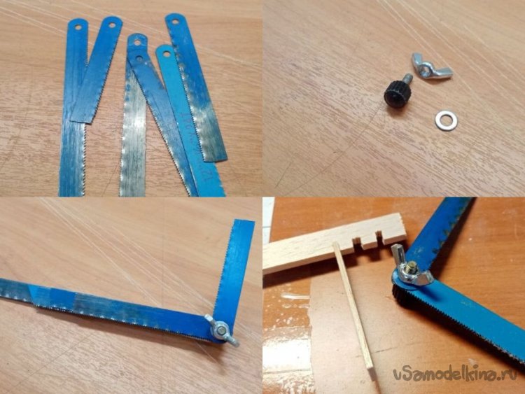 Нужно вклеит нервюры в заднюю кромку крыла. Изготовил универсальный «прорезатель» из старых пилок по металлу. Выбрал обломки с отверстиями. Собрал в пакет и закрепил винтом с барашком. Устанавливаю нужную ширину пропила, подбирая в пакет несколько пилок. Одна дает паз примерно в 1 миллиметр. На ненужной рейке подбираю ширину паза с таким расчетом, чтобы нервюра туго входила в него. Циакрин отлично клеит бальзу, глубок проникая в материал, но щелей в соединении быть не должно.