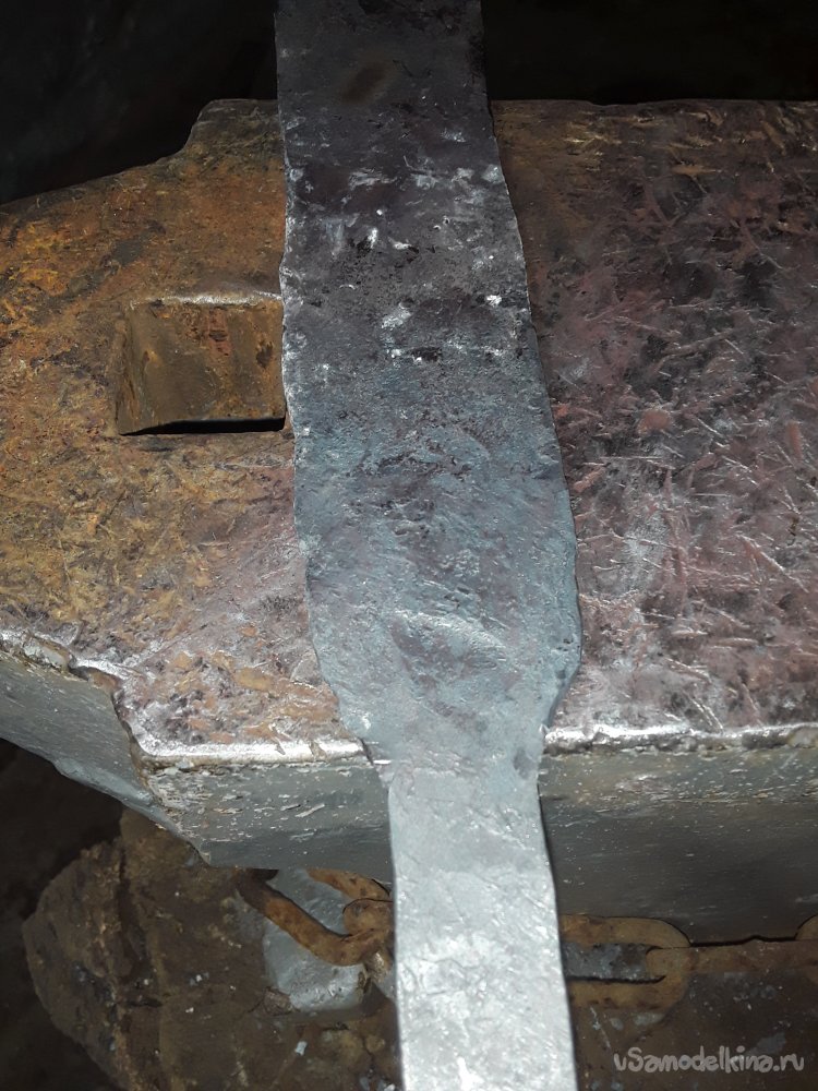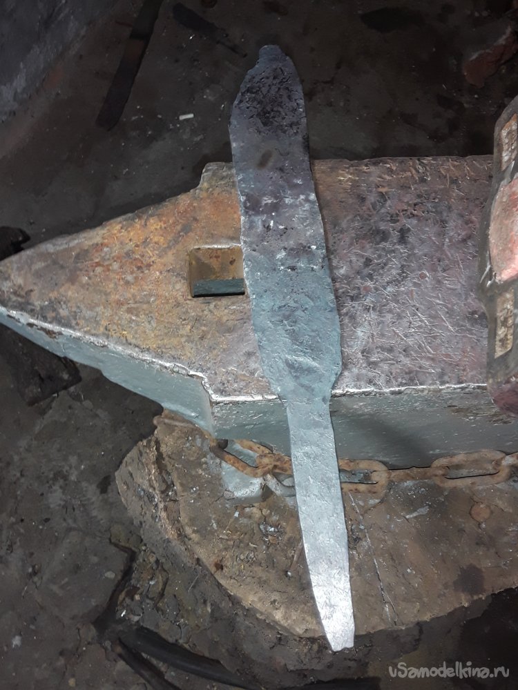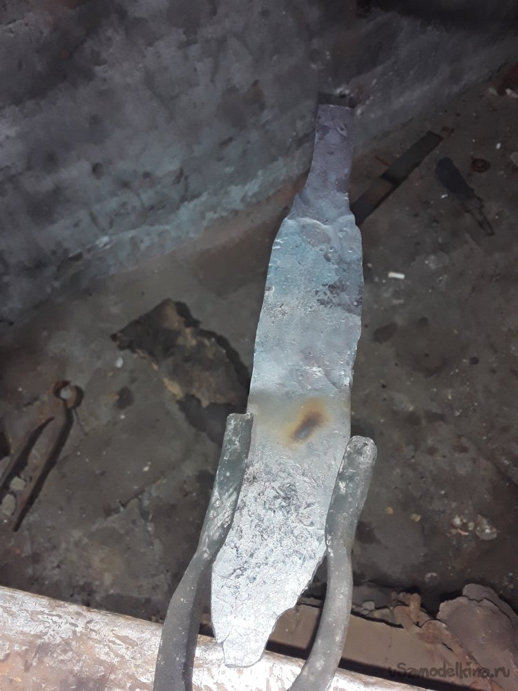 Для того чтобы приступить к ковке клинка нужно произвести так называемый отжиг стали, для того чтобы снять заводскую закалку. Для этого заготовку нагреваю до 900 градусов и даю остыть вместе с горном. На следующий вечер приступаю к нагреву и дальнейшей ковке клинка. Нагреваю до 900 гр и произвожу выравнивания металла так как я взял кусок от ушка рессоры. Для начала формирую острие ну а далее хвостовик. А уже потом произвожу вытягивание в длину и ширину клинка. После того как толщина в обухе стала 4мм произвожу ковку спусков при более низкой температуре. И в самом конце ставлю свое клеймо и произвожу выравнивание клинка перед закалкой.