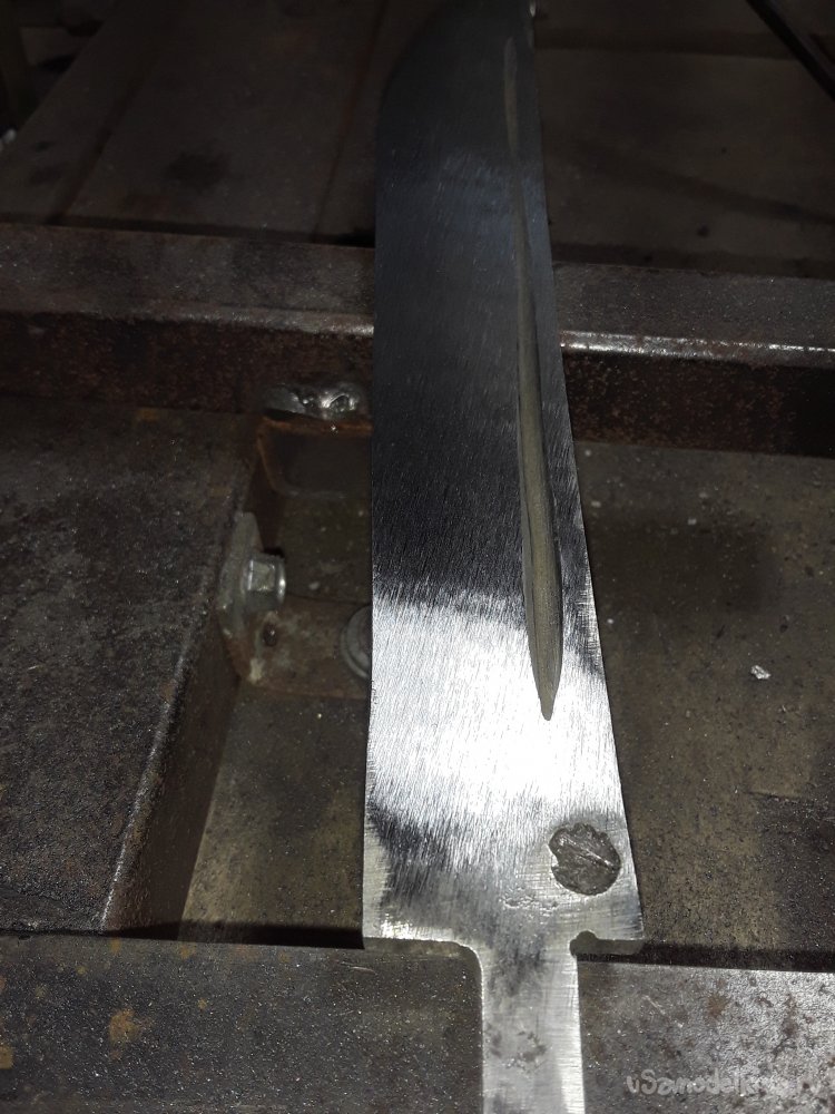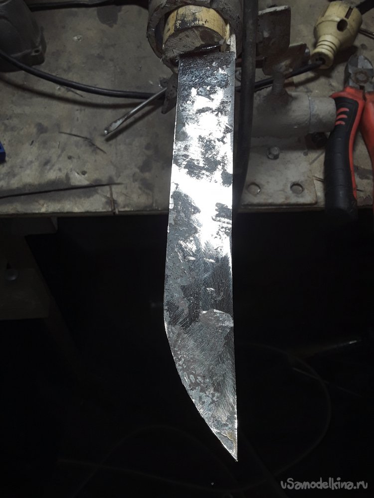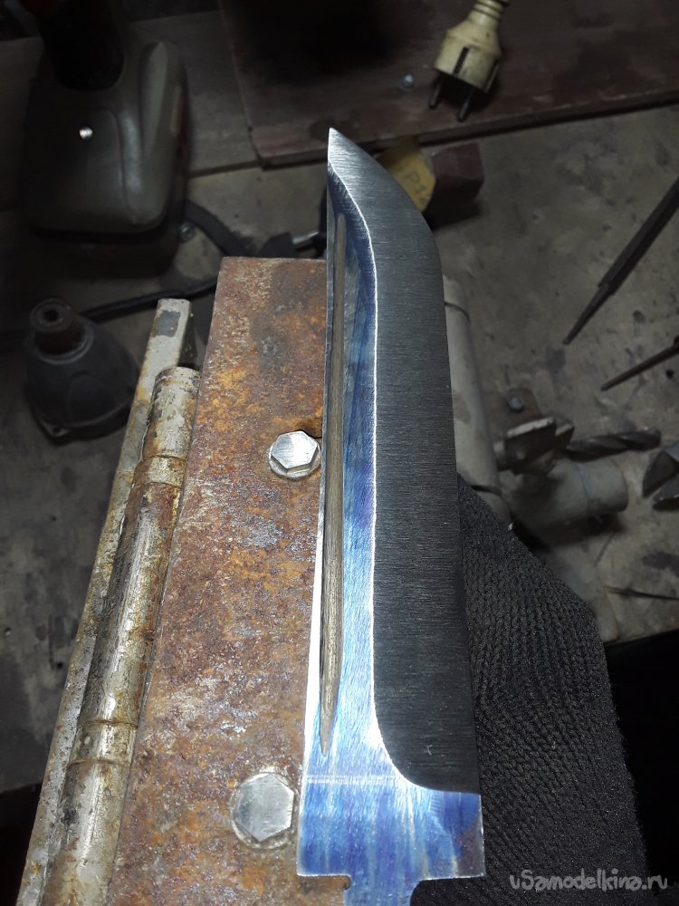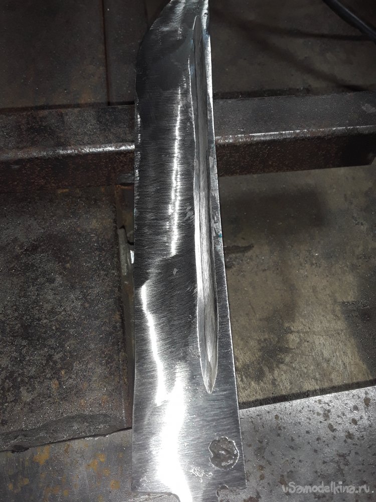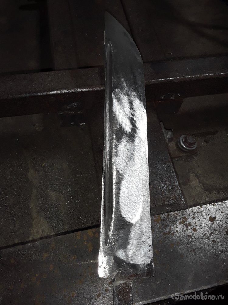 Для того чтобы нож был крепким, но в то же время не хрупким самое важное не закалка, а отпуск. Клинок нагреваю до 900гр и окунаю в масло подогретое до 50гр на пару секунд затем оставляю на догорающих углях в отключённом горне. После полного остывания можно без проблем работать с металлом он будет хорошо шкурится так как основные единицы прочности он получит после отпуска. После того как все остыло, а в моем случае следующий вечер приступаю к шлифовке всего что лишнее на клинке. Потом с помощью ушм нарезаю долы на клинке тонким отрезным диском потом толстым шлифовальным 5мм.