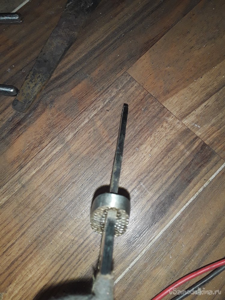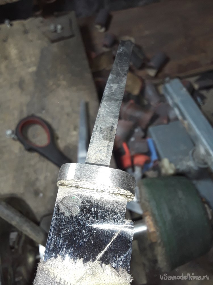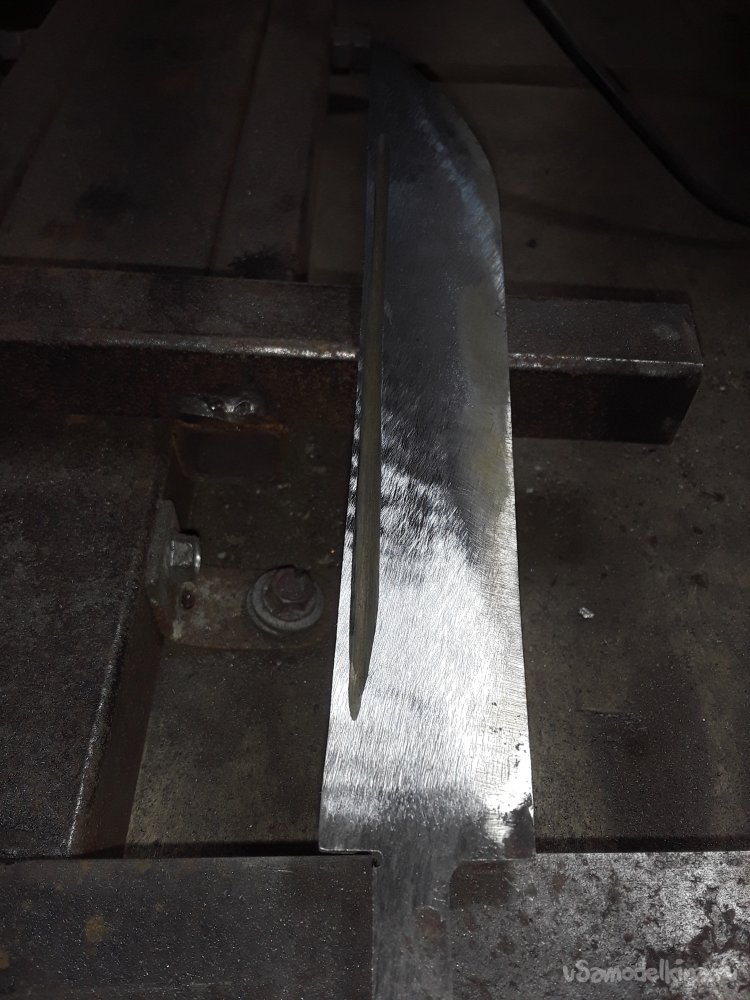Далее самое тяжелое для меня это формирование клина на клинке. Благодаря приспособлениям все же прошло лучше, чем ожидал потому что молотом не всегда все более менее откуется потом мучаемся на гриндере. Не знаю сколько там получилось градусов, но вроде бы все нормально вышло. Главное правело это все очень хорошо остужать чтобы не испортить закаленное лезвие. После спусков произвожу отпуск клинка при температуре 200гр в течение 2‑х часов на клинке должны быть цвета побежалости золотого цвета. Следующий немаловажный этап это подгонка больстера или как простыми словами упора. Так как в нашей и любой другой стране есть статья об изготовлении холодного оружия упор должен быть не более 5 мм, то есть рукоять должна быть травмоопасной. Больстер вырезаю из пластины нержавейки толщенной 8мм просверливаю отверстия после разметки центра и довожу подгонку набором надфилей. Самое что бросается в глаза это больстер по этому его нужно подогнать идеально плотно к клинку тогда все будет красиво. Для эстетики вырезаю два квадрата из нержавейки 1мм для проставок между больстером и рукоятью.