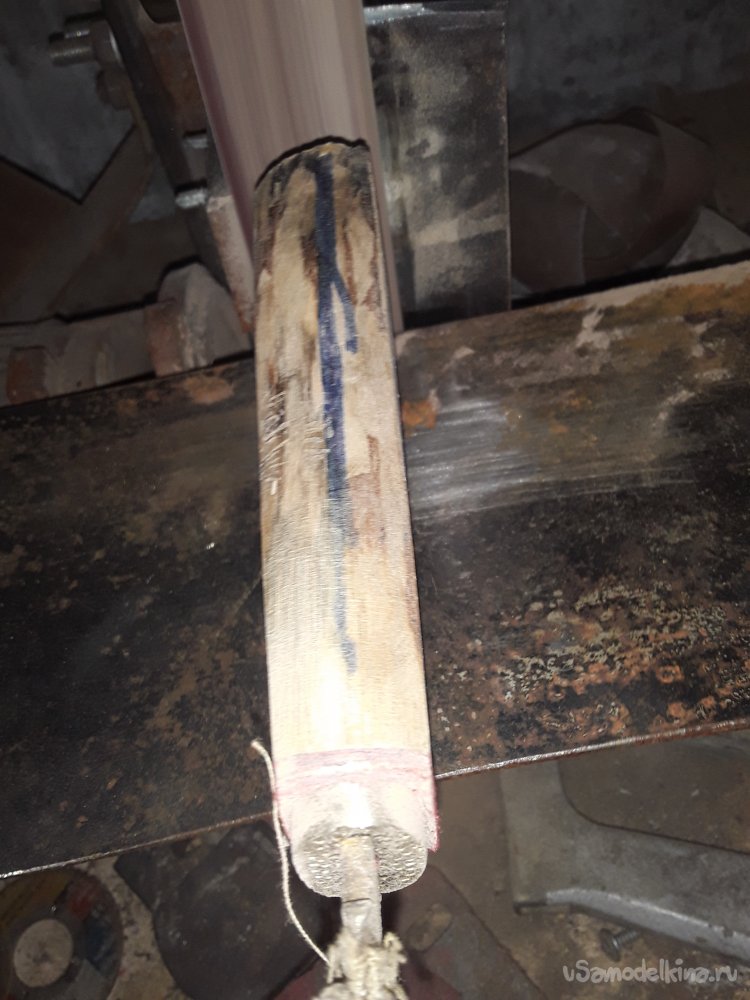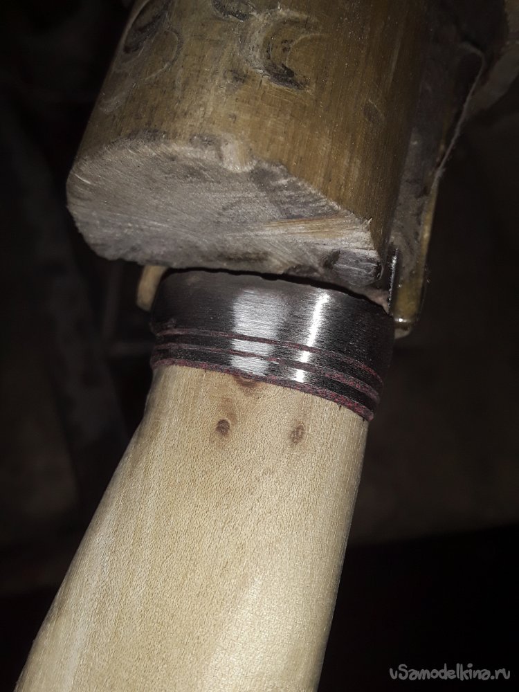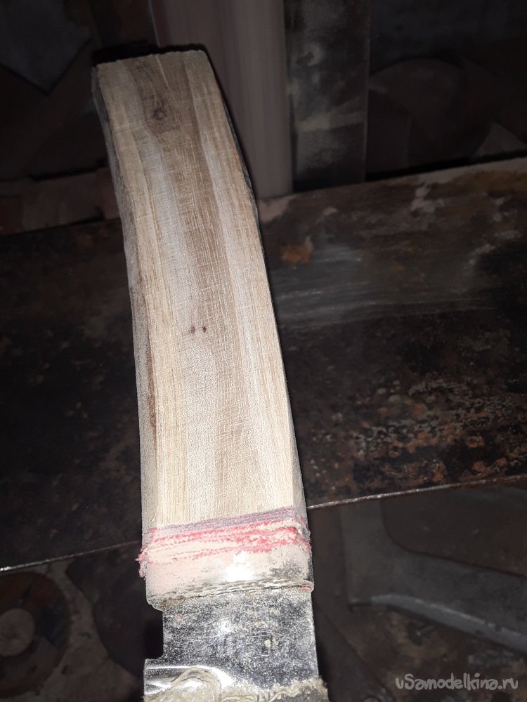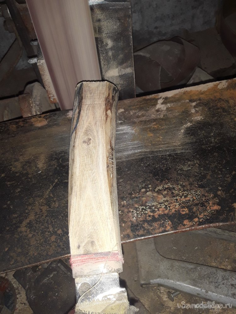Ну вот и все с работой металла теперь осталось сделать рукоять. В наших краях очень много растет карагача я как то делал из него рукоять и был очень доволен его простым рисунком, а самое главное его очень прочным свойством. Самое главное это его высушить, а сохнуть он долго. Я же для того, чтобы были всегда запасы дерева приезжаю осенью в лесополосу и подбираю самые ровные ветки которые просто валяются под ногами и уже высохшие как мне надо. Для того чтобы все держалось прочно делаю в центре отверстия в два раза больше чем толщина клинка. Просверливаю немного расширяя отверстия во внутри бруска, а на хвостовике делаю насечки. Для хорошей прочности в клей добавляю алюминиевую стружку и через куски скани чередую вставки. Теперь после всех подгонок зажимаю на шпильках и оставляю на сутки сушиться.