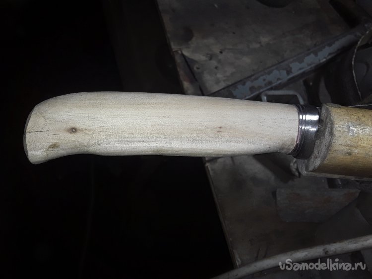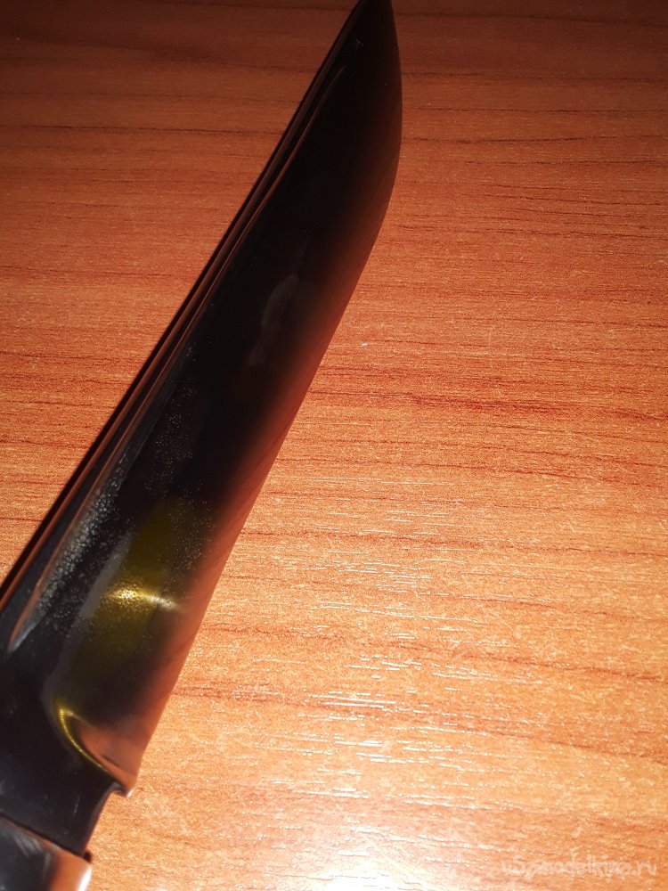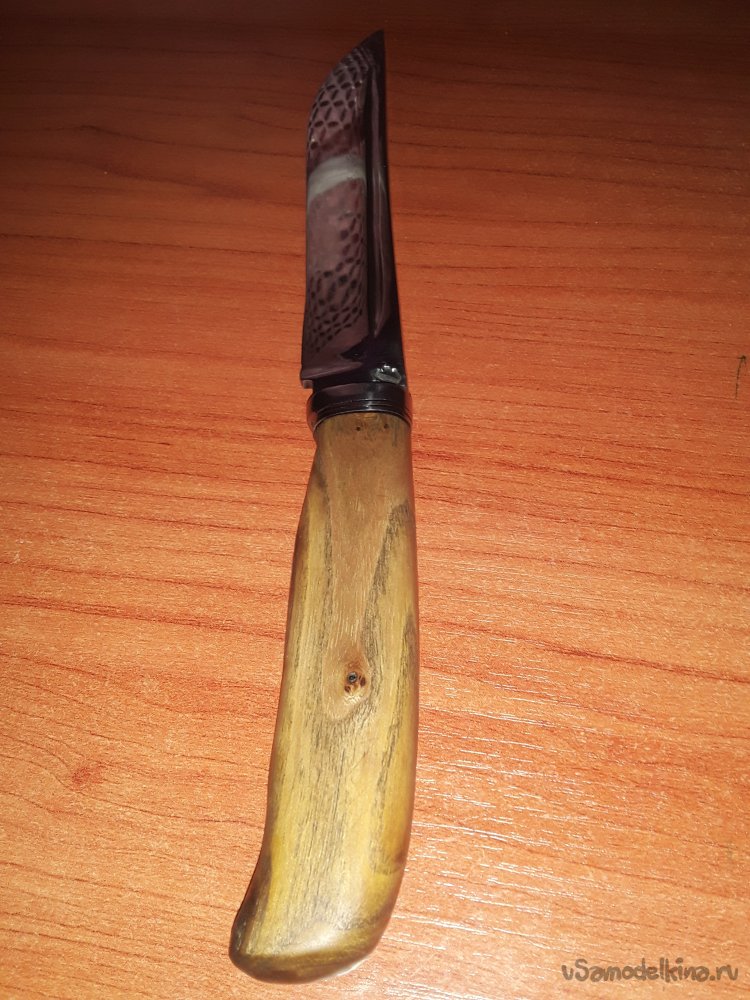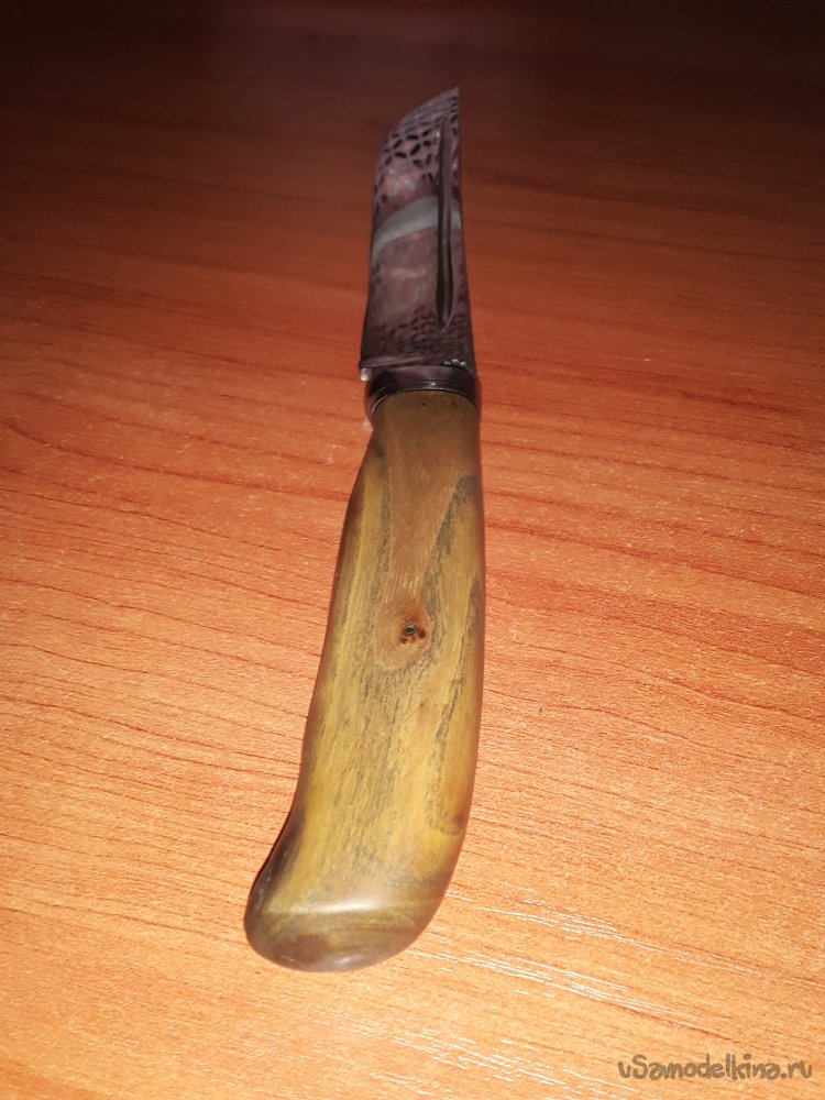 Длина клинка получилась 17см а рукояти 13см в целом нож легкий и удобный для использования как в домашних, так и хозяйственных целях. Травить клинок не стал так, попросил хозяин не знаю зачем. На все работы у меня ушло 4 вечера по пару часов в день так как 11 часов я нахожусь на работе, а так можно и за 2 дня все было сделать. Ручка после пропитки олифой осталась гладкой, но не скользкой правда немного пахнет. Обычно я изначально сначала стабилизирую брусок, а потом только собираю рукоять. А на сегодня таких брусков нет и по этому просто пропитал и немного отполировал но все равно через пару дней олифа полимеризуется и станет прочной хотя сам по себе карагач очень прочный.