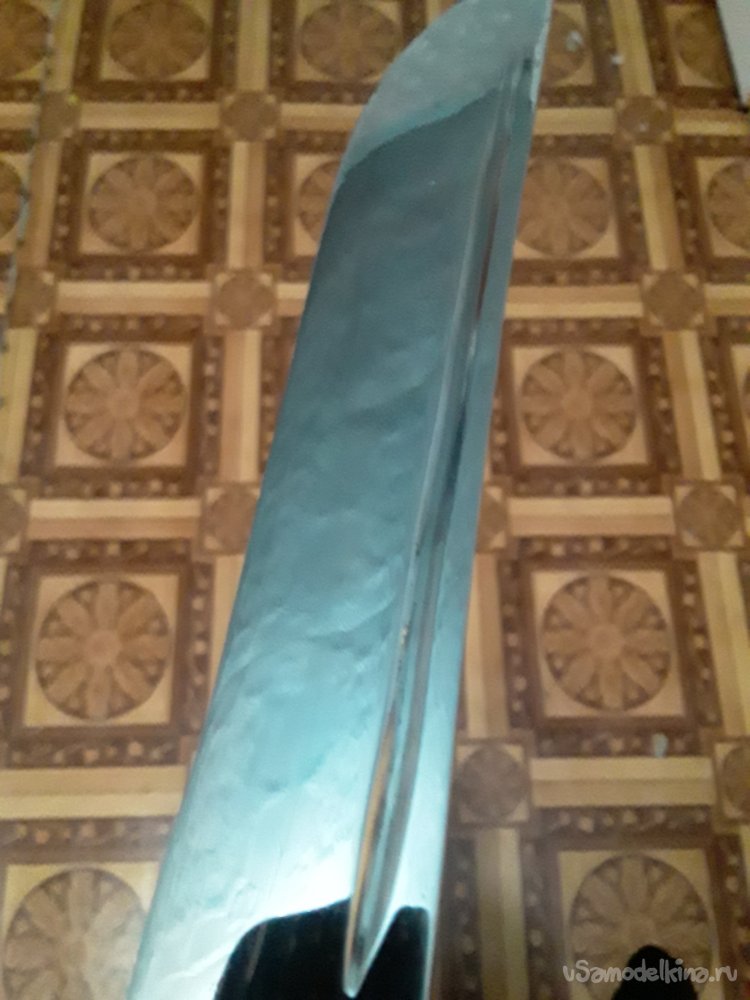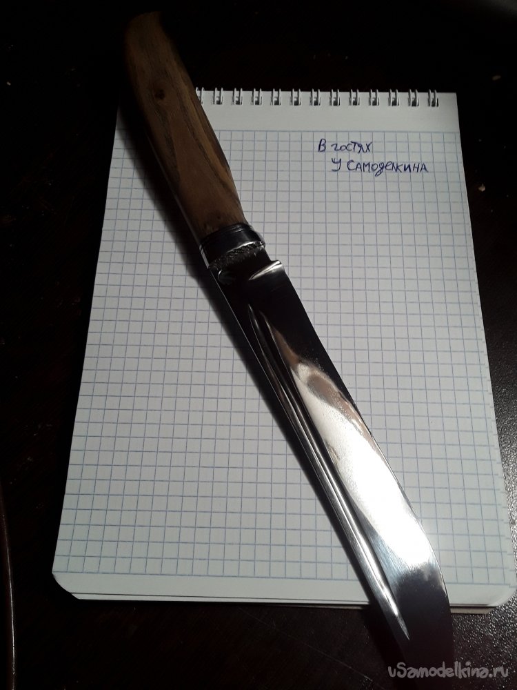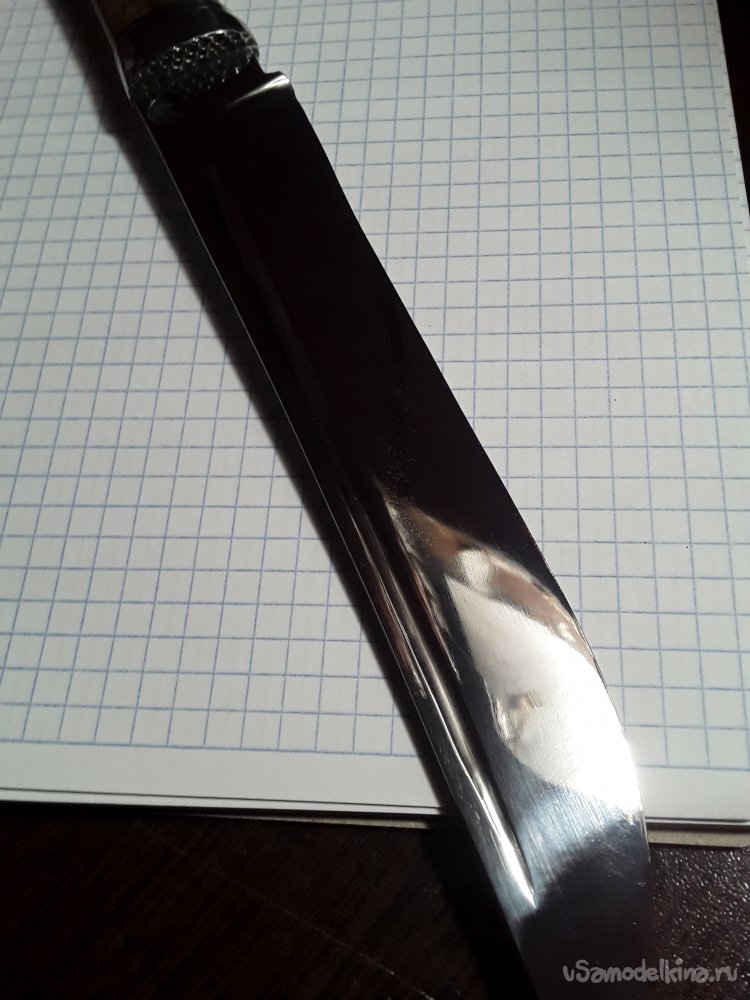 На последнем фото вид после пропитки рукояти олифой в вакуум-камере к сожалению не получилось сделать фото да и ничего необычного там нет. Ну и последний самый важный этап это полировка клинка и рукояти. Клинок полирую разным зерном от 400 и до 3000 а потом на войлочном круге пастой гои 1и 2 номером до блеска. Прям идеально не нужно так как хозяин будет травить клинок. Ну а в целом клинок получился блистящем, а рукоять после 2‑х дней сушки после пропитки прохожу 2000 наждачной и полирую просто на хб круге при малых оборотах без использования пасты так как она сильно забьет древесину черным цветом.