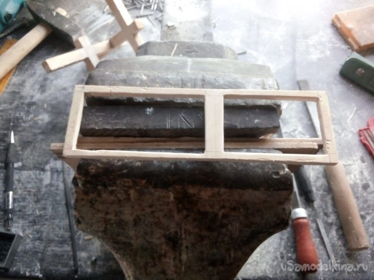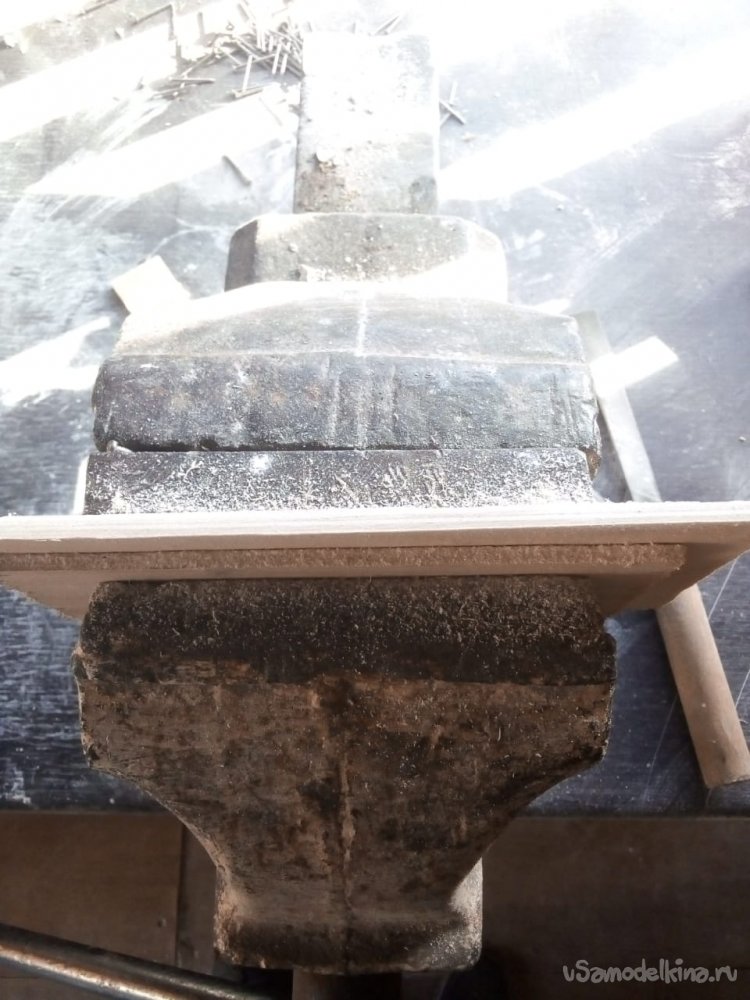 15. Склеиваем обе части при помощи клея ПВА. (Можно любым, но я советую склеивать именно этим.) Плотно прижимаем тисками для лучшего склеивания. Проходим ещё раз наждачкой по сторонам.
