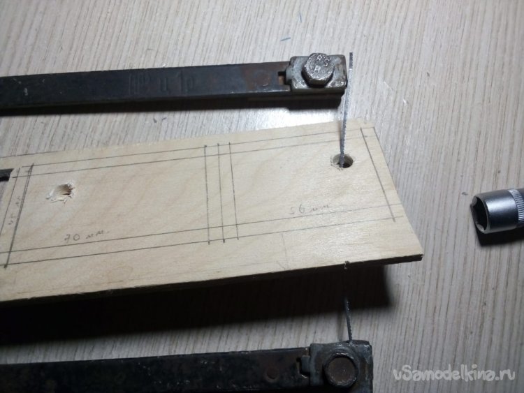 7. При помощи сверла (у меня оно на 7 мм) просверливаем. Сверло можно взять любое, главное чтобы полотно лобзика проходило.