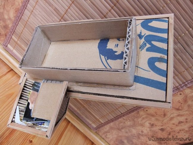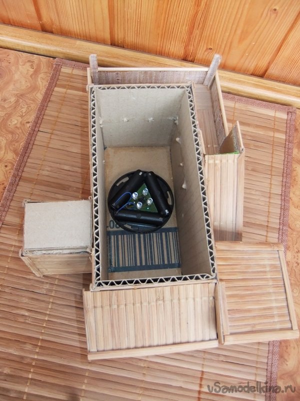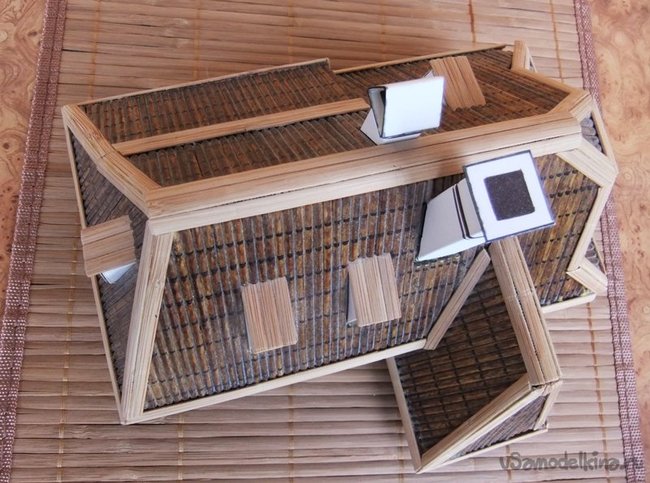 Необходимыми инструментами будут: ножницы, нож, угольник, маникюрные бокорезы, надфили, наждачная бумага, кисточка, маркер черного цвета. Начинается изготовление со сборки и склейки из картона корпуса здания (без крыши). После надежного высыхания можно приступить к обклейке стен вырезанными из бамбуковой салфетки заготовками.