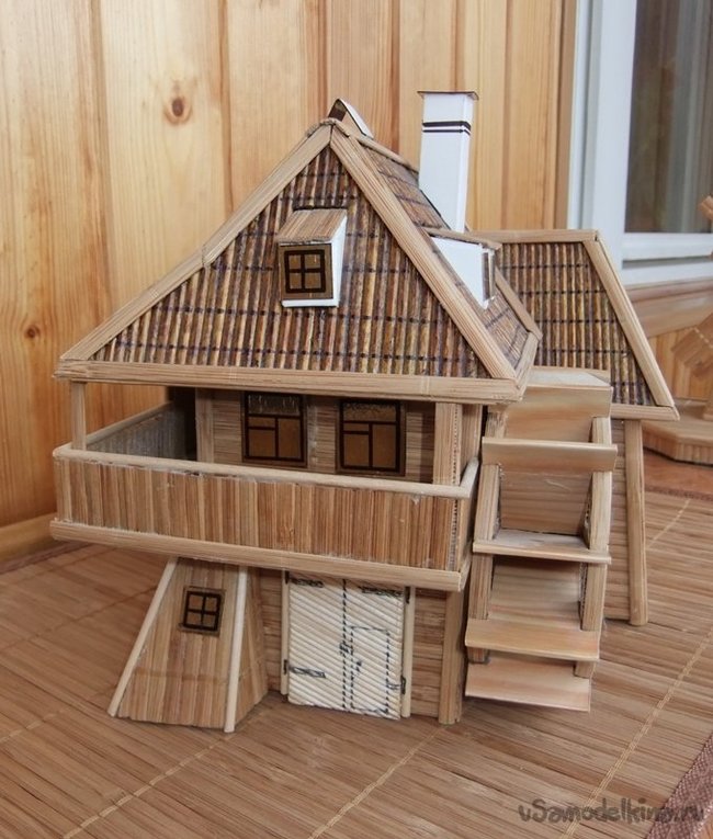 Материалами для работы служат бамбуковые салфетки, бамбуковые палочки (шпажки), бамбуковые зубочистки, гофрированный картон, плотный белый картон, полупрозрачная пленка для окон, клей, лак.