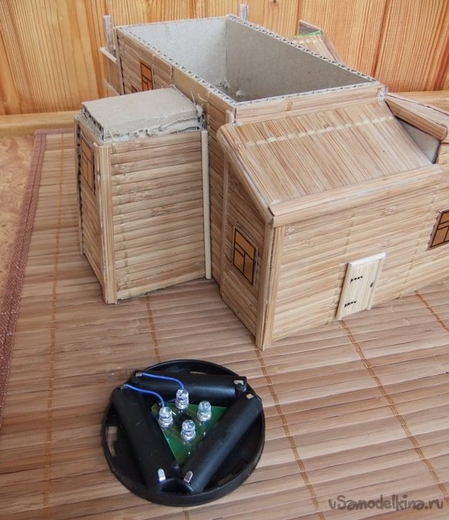 В прорезях здания и крыши установить окна из полупрозрачной пленки, в корпус здания положить светодиодный фонарь и закрыть крышей. Фонарь применен с автоматическим включением по мере наступления темноты. (от садовых фонарей со светорезистором)
